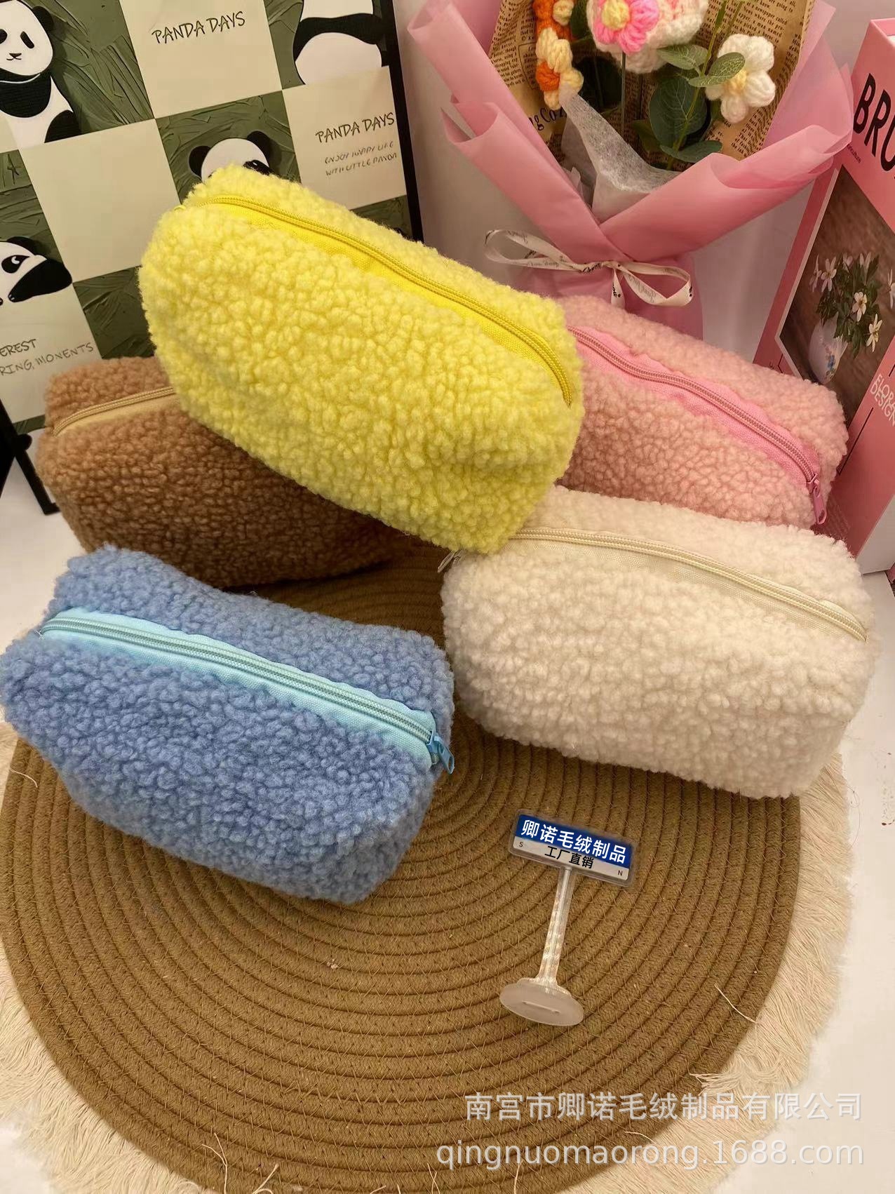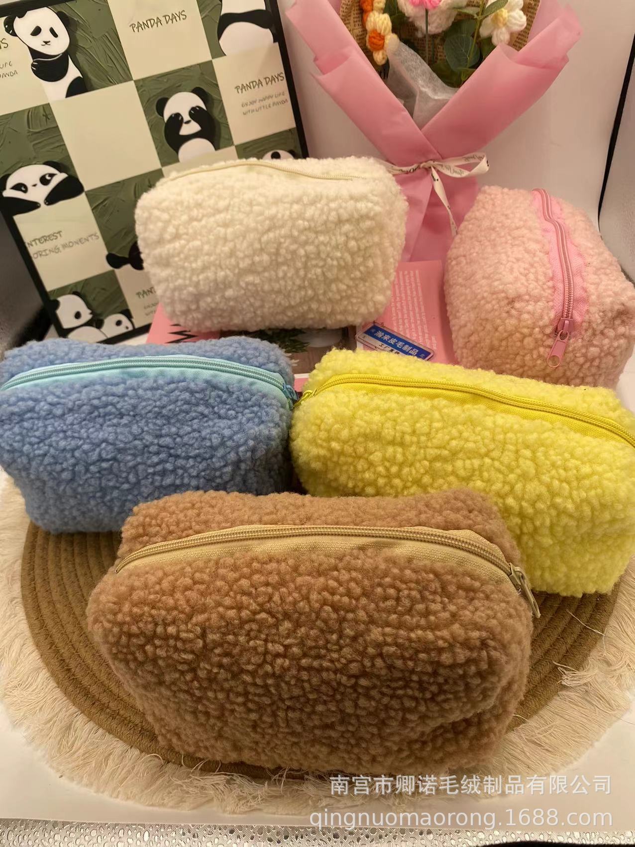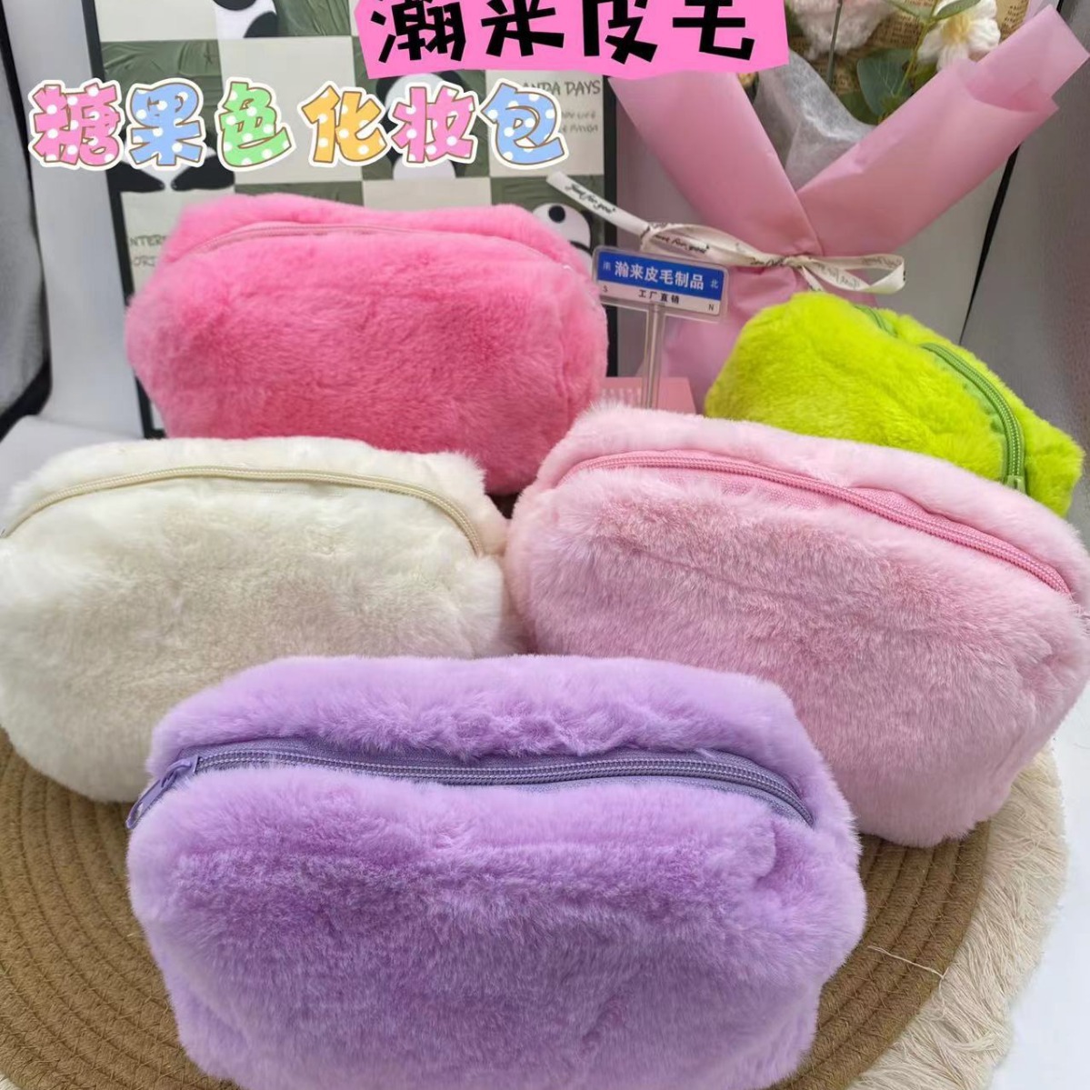 ins少女系马卡龙毛绒笔袋手拎包糖果色便携甜美软糯化妆包笔袋