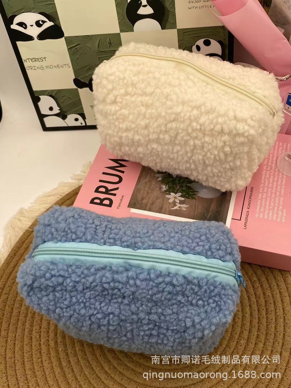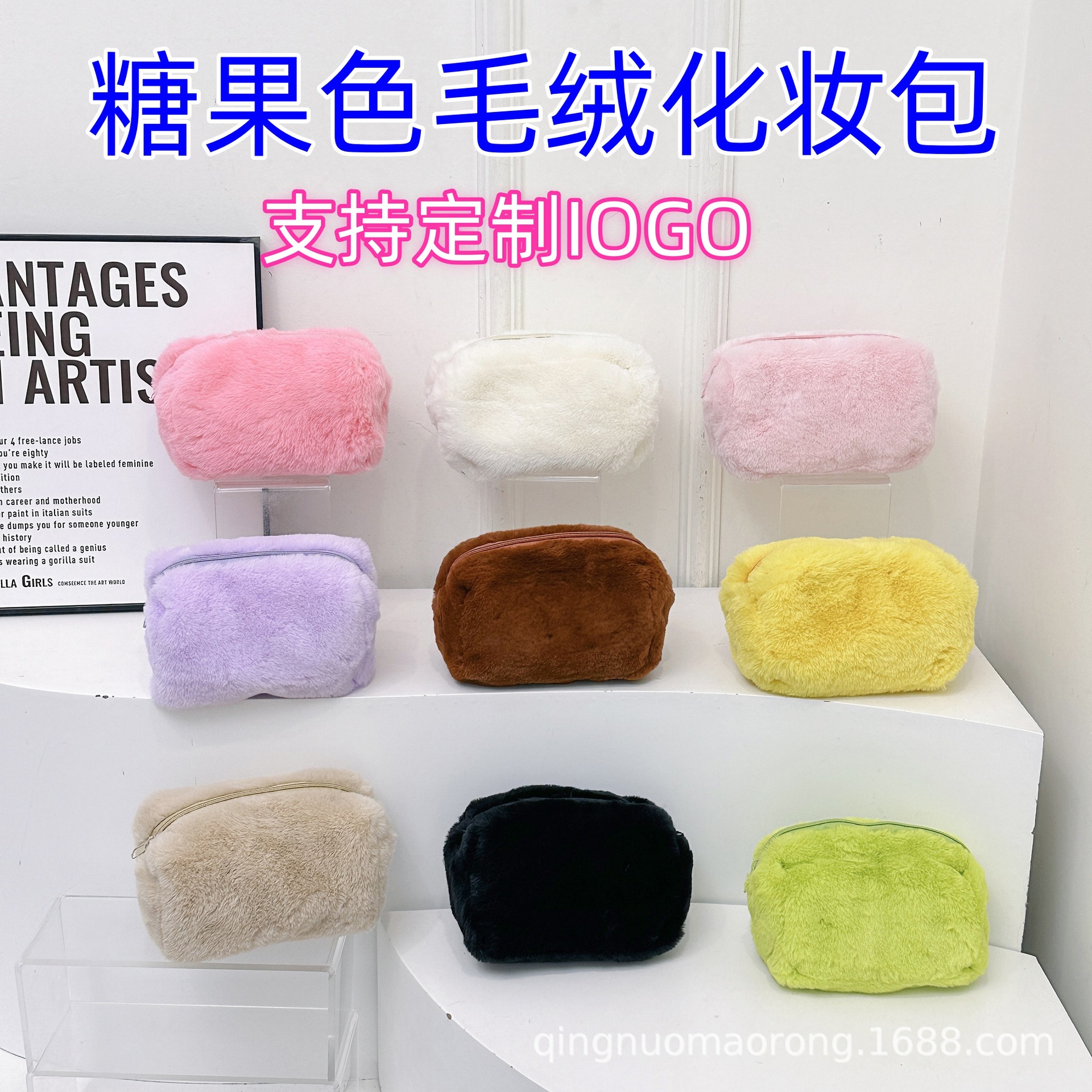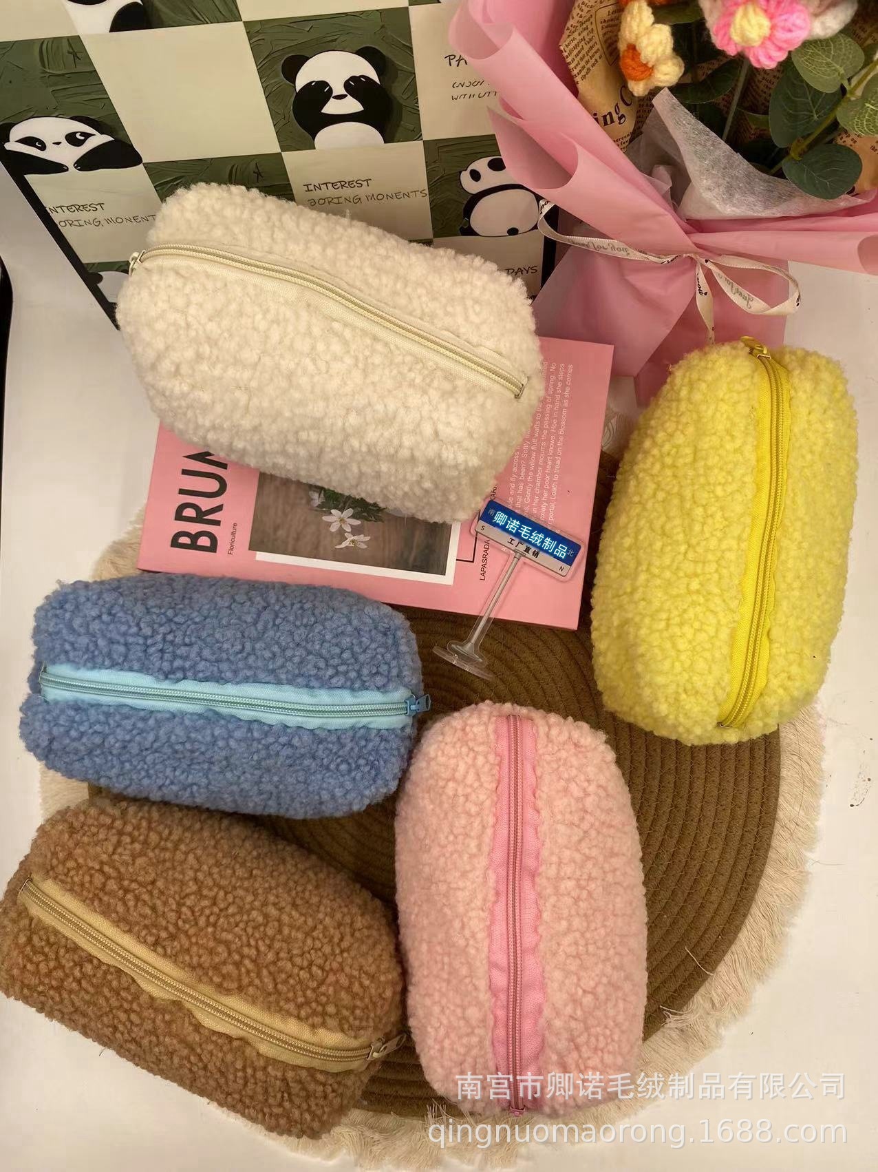 ins少女系马卡龙毛绒笔袋手拎包糖果色便携甜美软糯化妆包笔袋