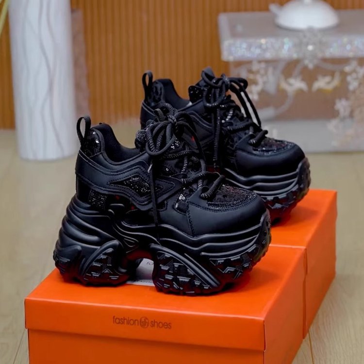 黒のインナー高さの厚底ダッドシューズ婦人靴2025秋冬新作プラスベルベット小柄な人向けの足を小さく見せるスポーツシューズ