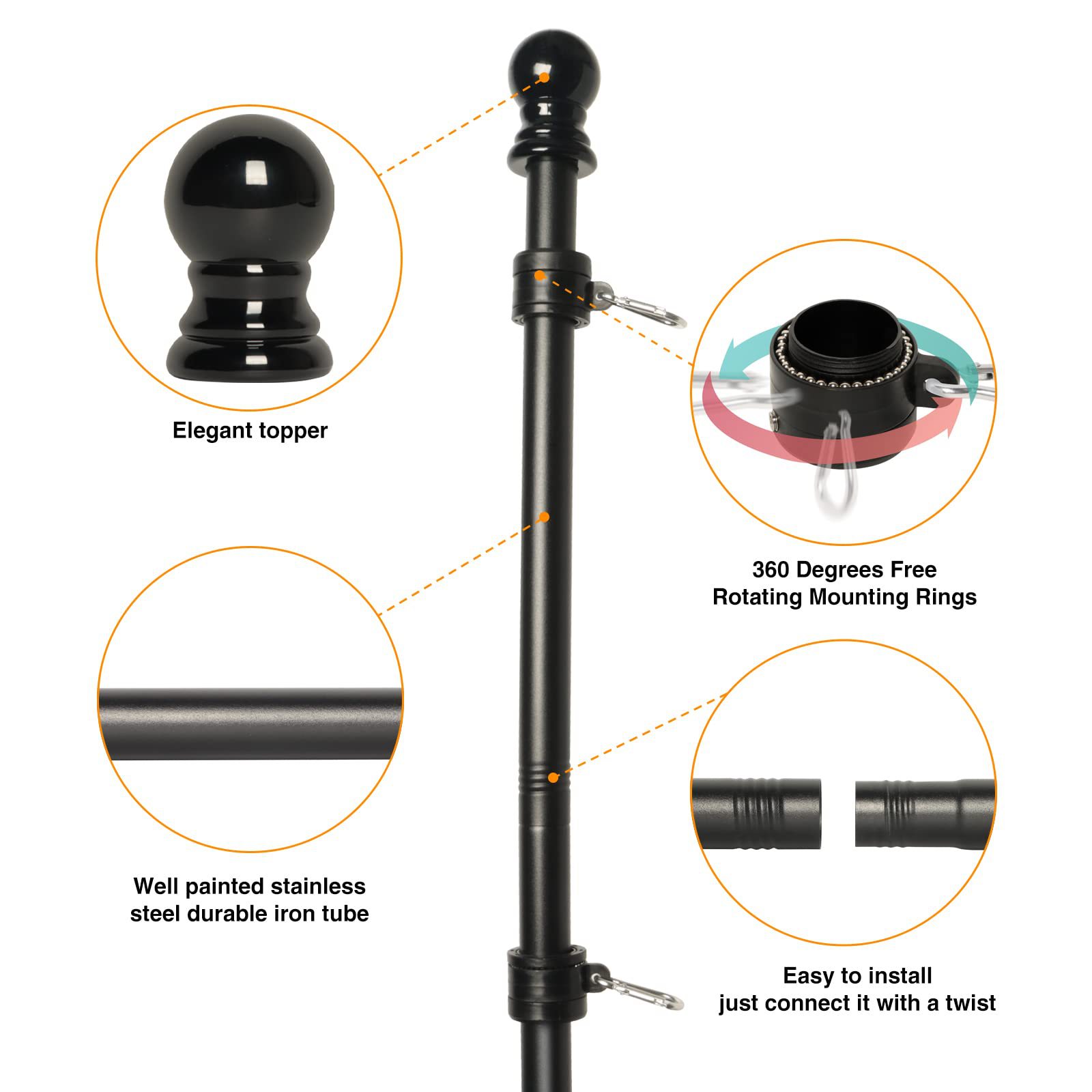 壁掛け屋外用 2.4mフィート 5段ステンレス旗竿、絡まりにくい、回転可能、連結可能、斜め差し旗竿