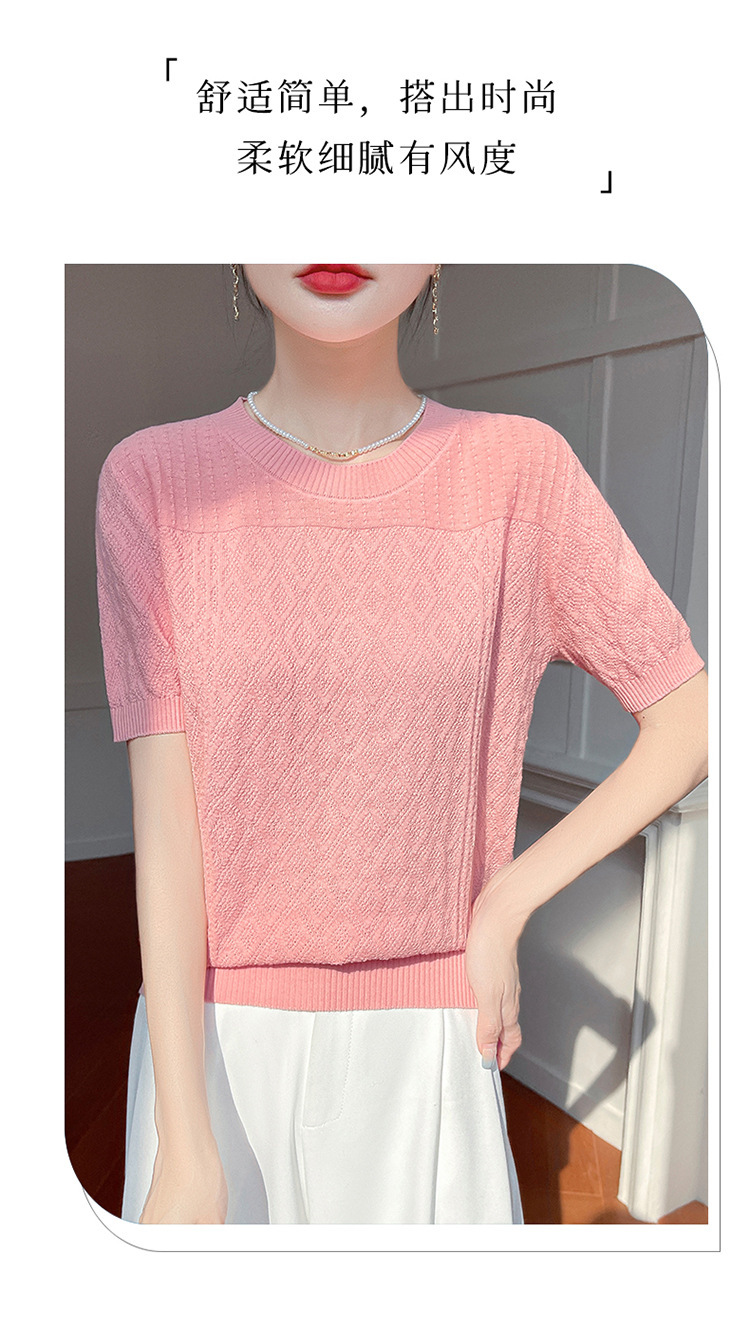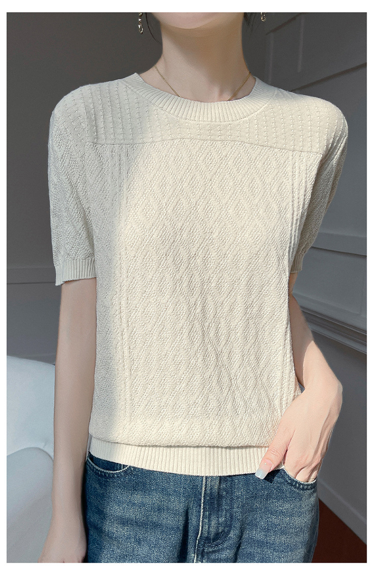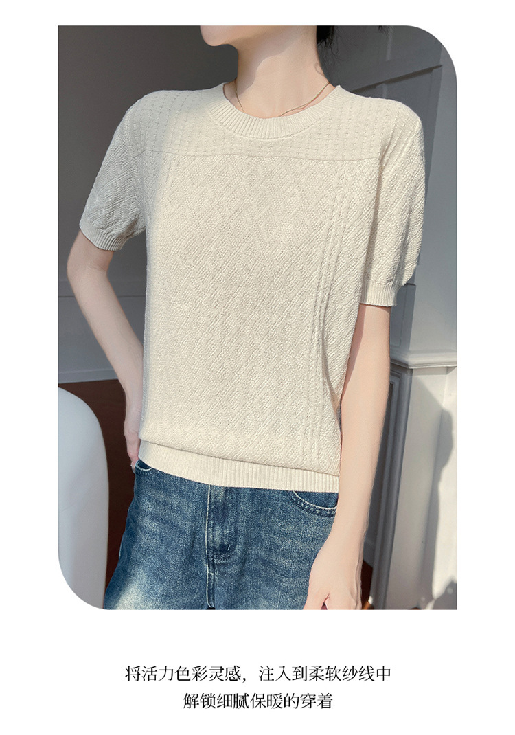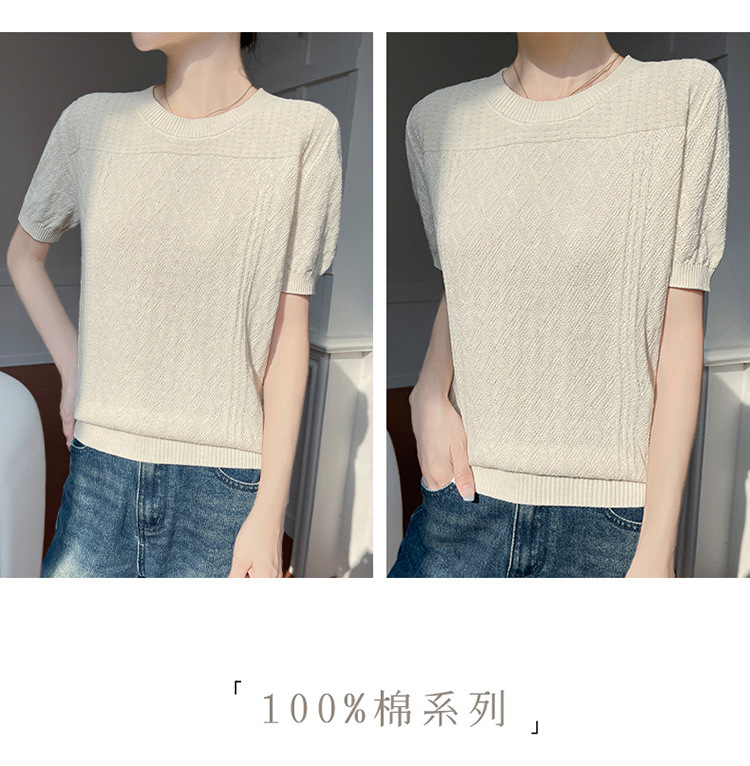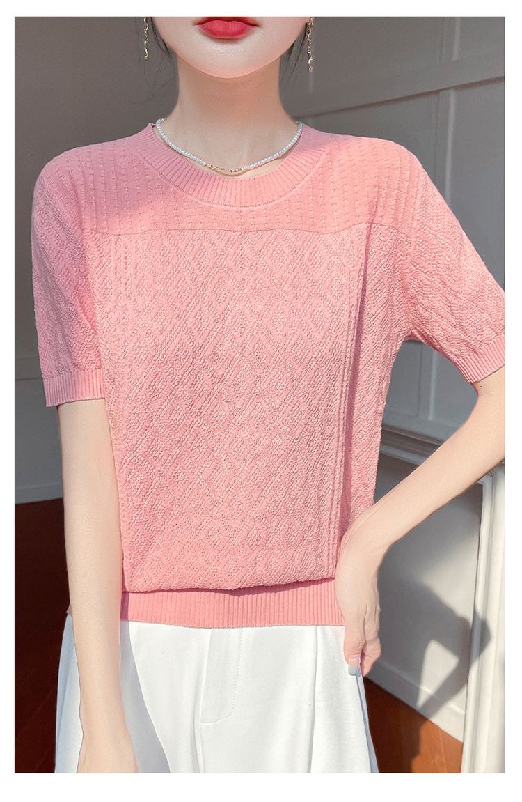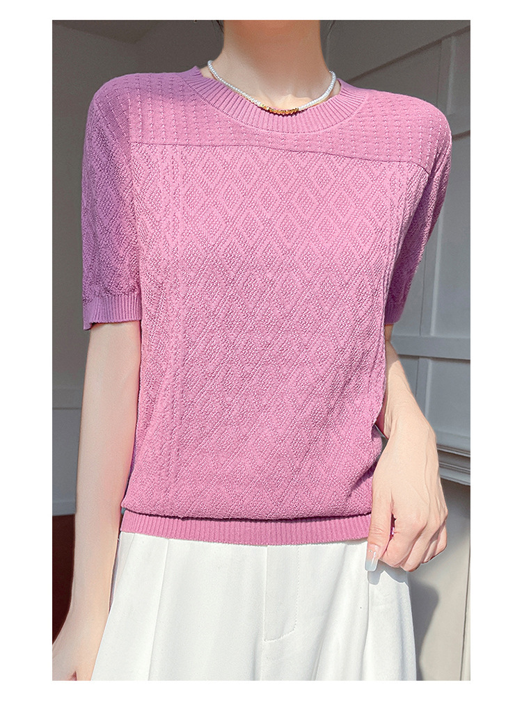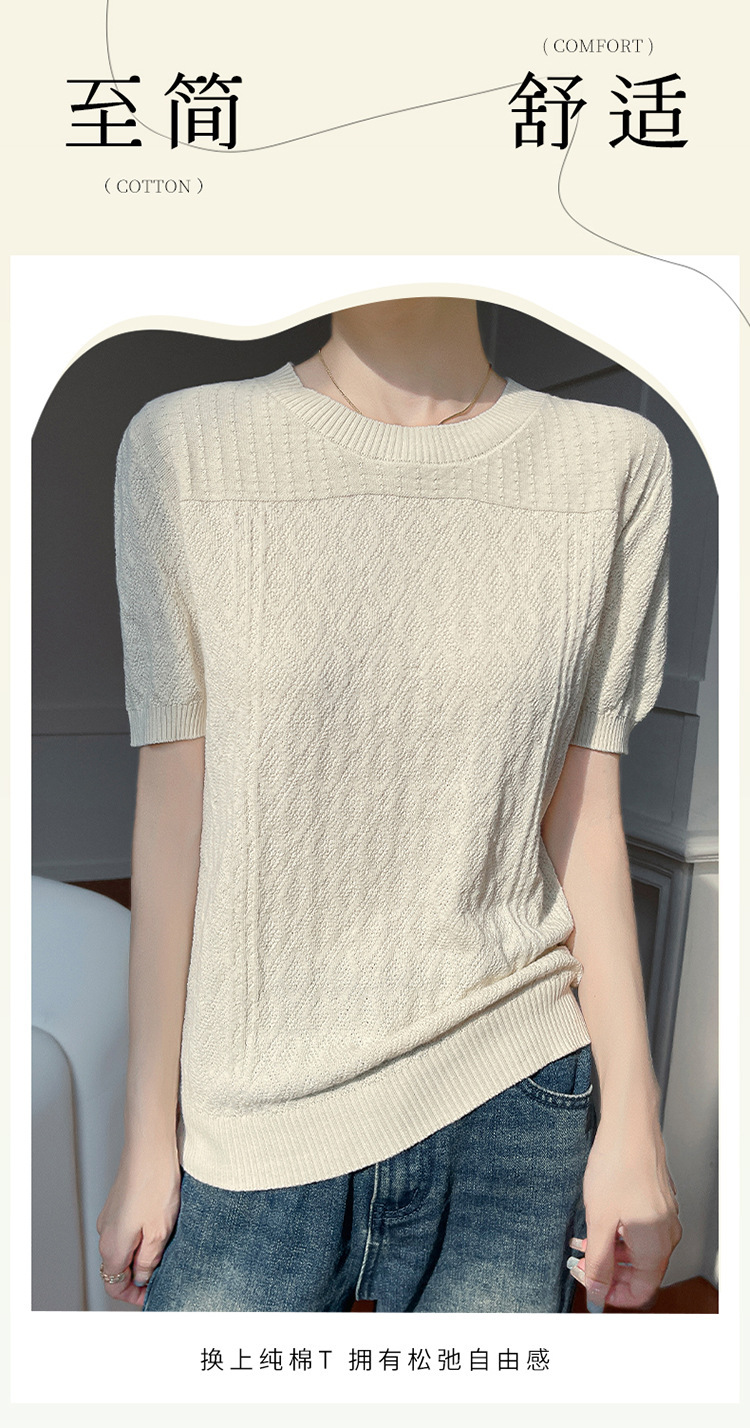 2025年春夏新作純綿糸丸襟ニット半袖tシャツ女性ひし形ジャカードゆるいプルオーバー