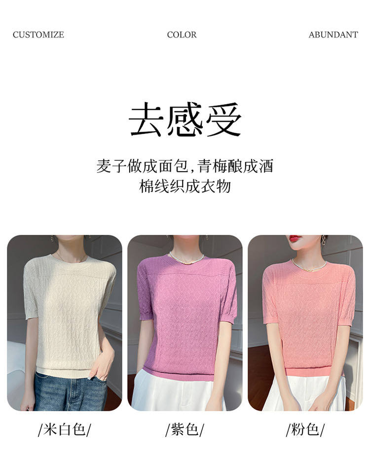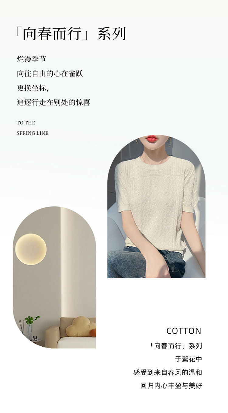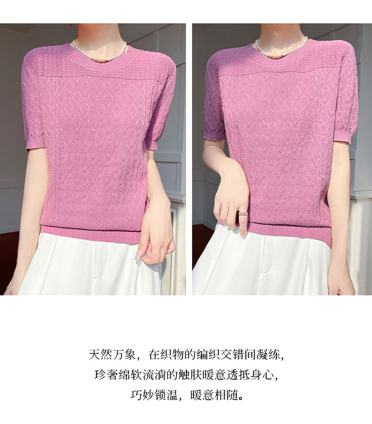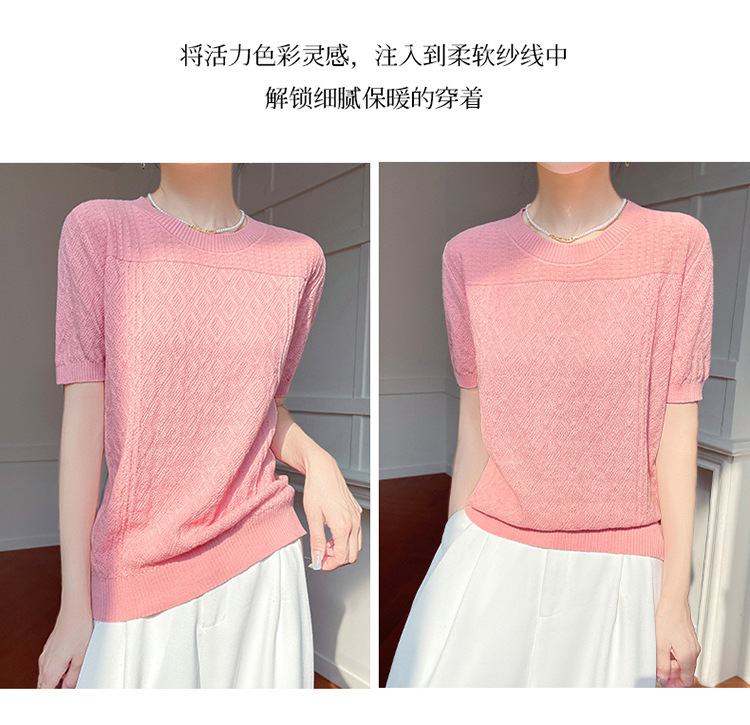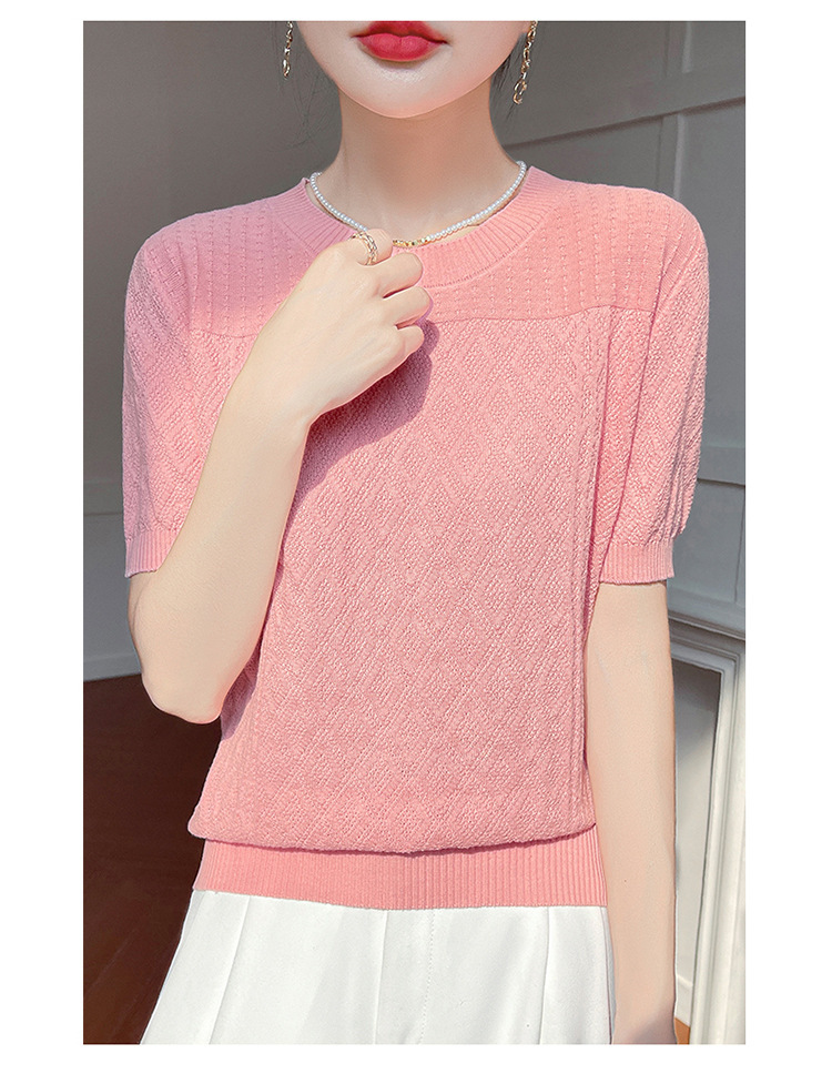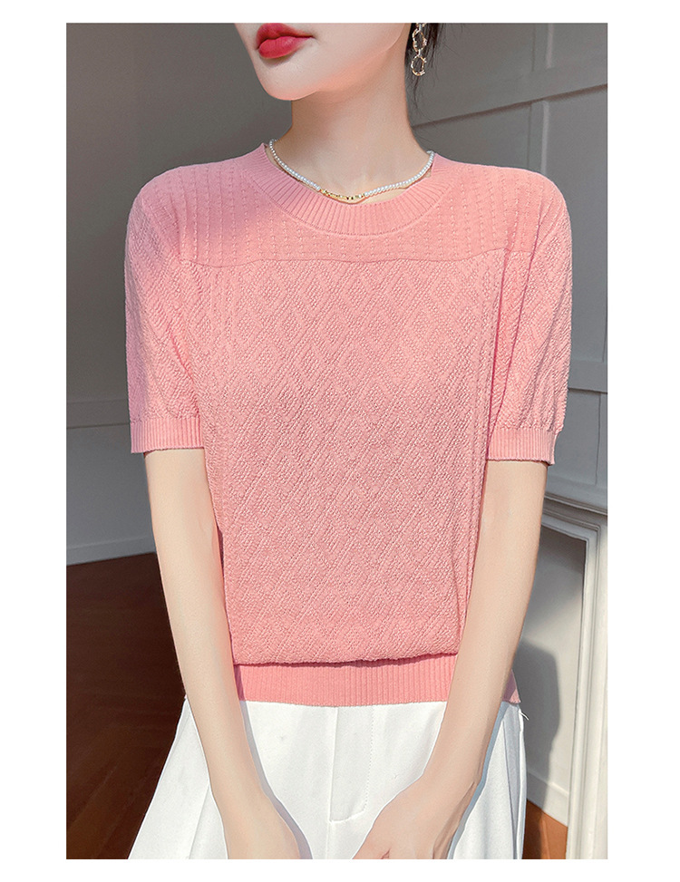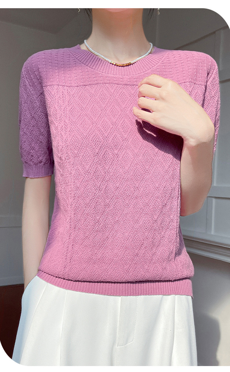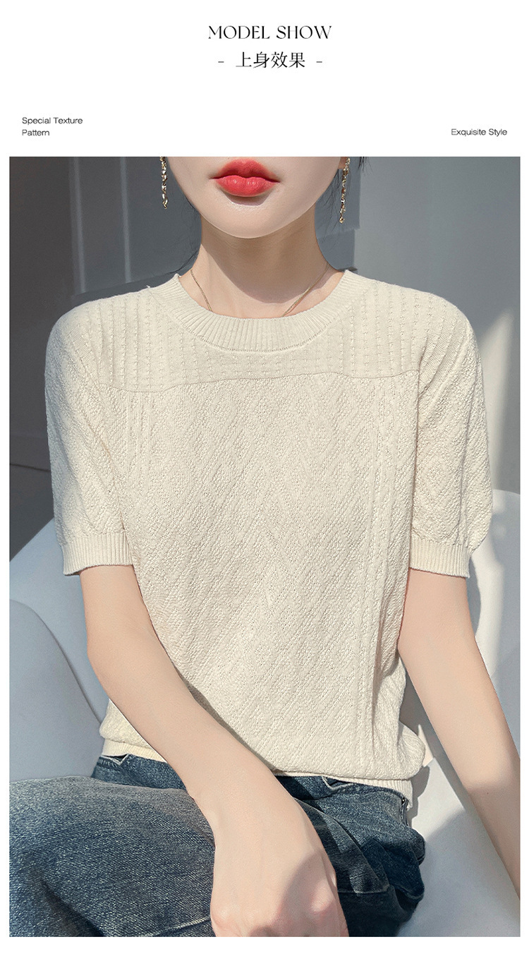 2025年春夏新作純綿糸丸襟ニット半袖tシャツ女性ひし形ジャカードゆるいプルオーバー