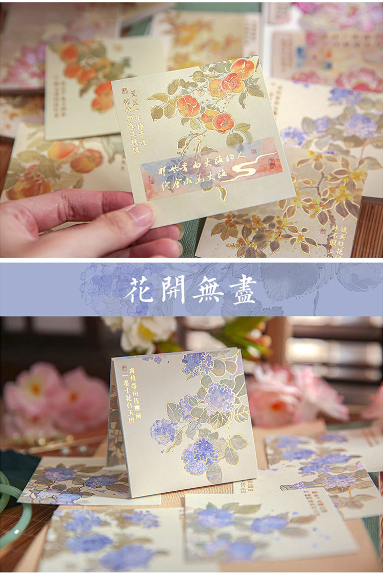 仕様 花は終わりなく咲く(ホットスタンプ60枚),清水ハイビスカス(箔押し60枚),すべてがうまくいきます(ホットスタンプ60枚),ラッキーゴールデンシナモン(ホットスタンプ60枚)