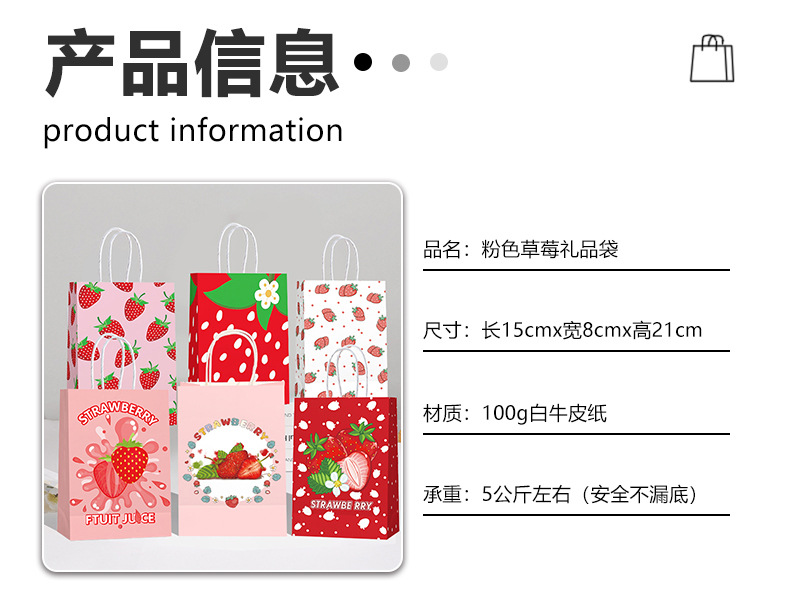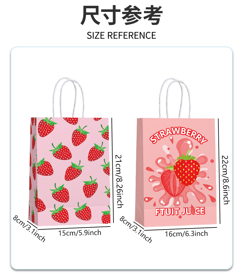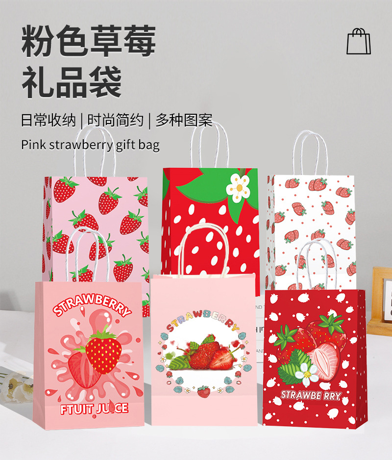 仕様とモデル イチゴのフルバージョン; 15*8*21; クラフト紙,赤いイチゴ 1 個; 16*8*22; クラフト紙,ピンクのイチゴ 1 個; 16*8*22; クラフト紙,イチゴ 2 個; 16*8*22; クラフト紙,複数のイチゴ; 16*8*22; クラフト紙,赤いイチゴ; 15*8*21; クラフト紙,イチゴのハンドバッグ; 12*8*21; クラフト紙