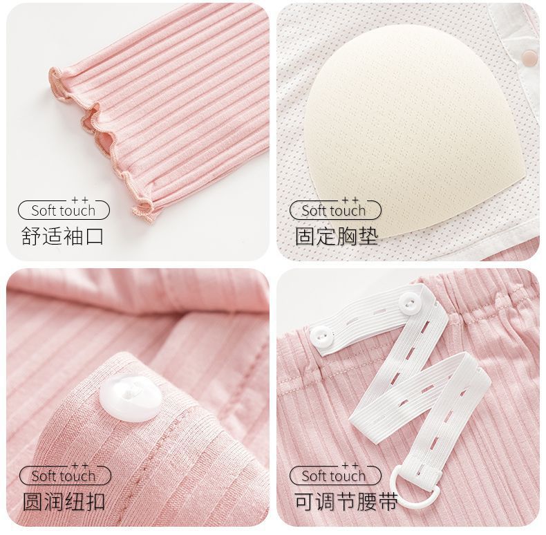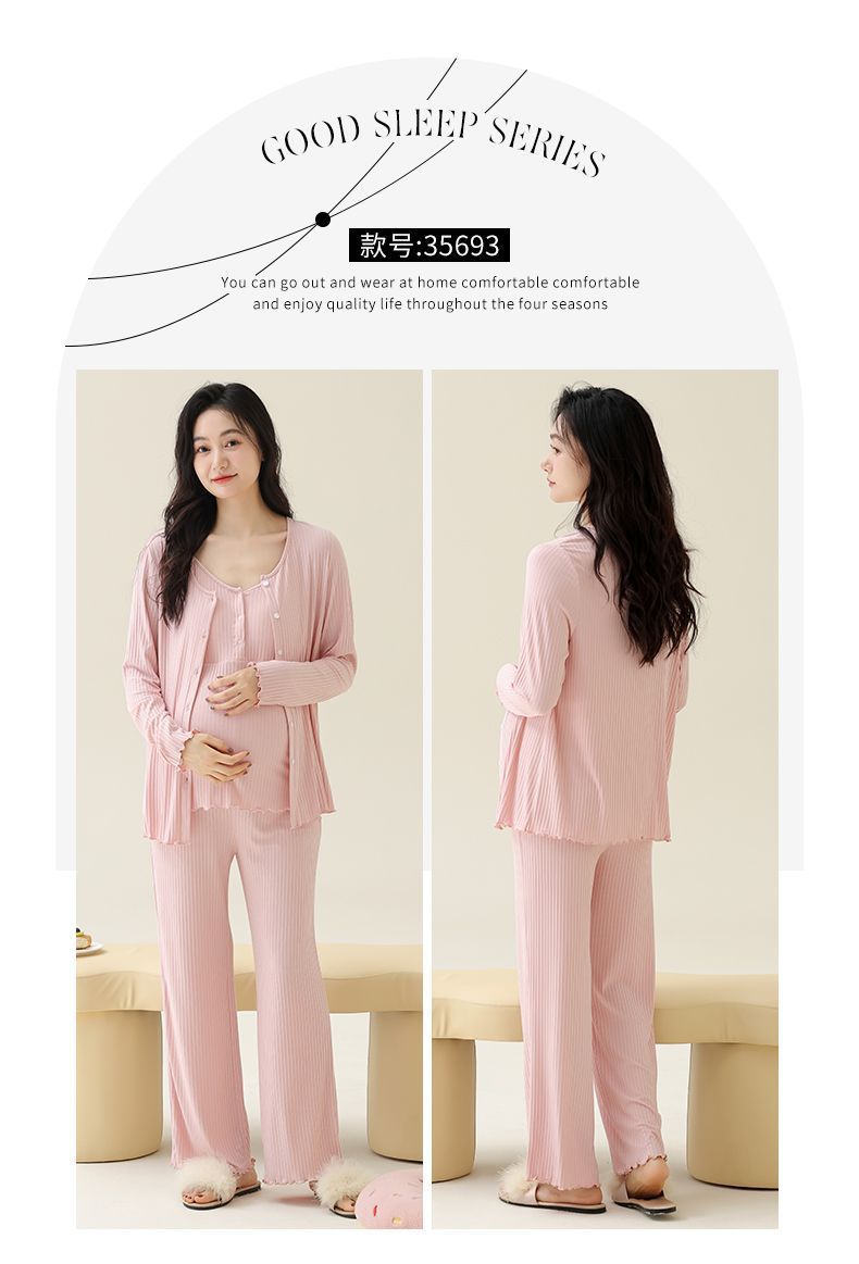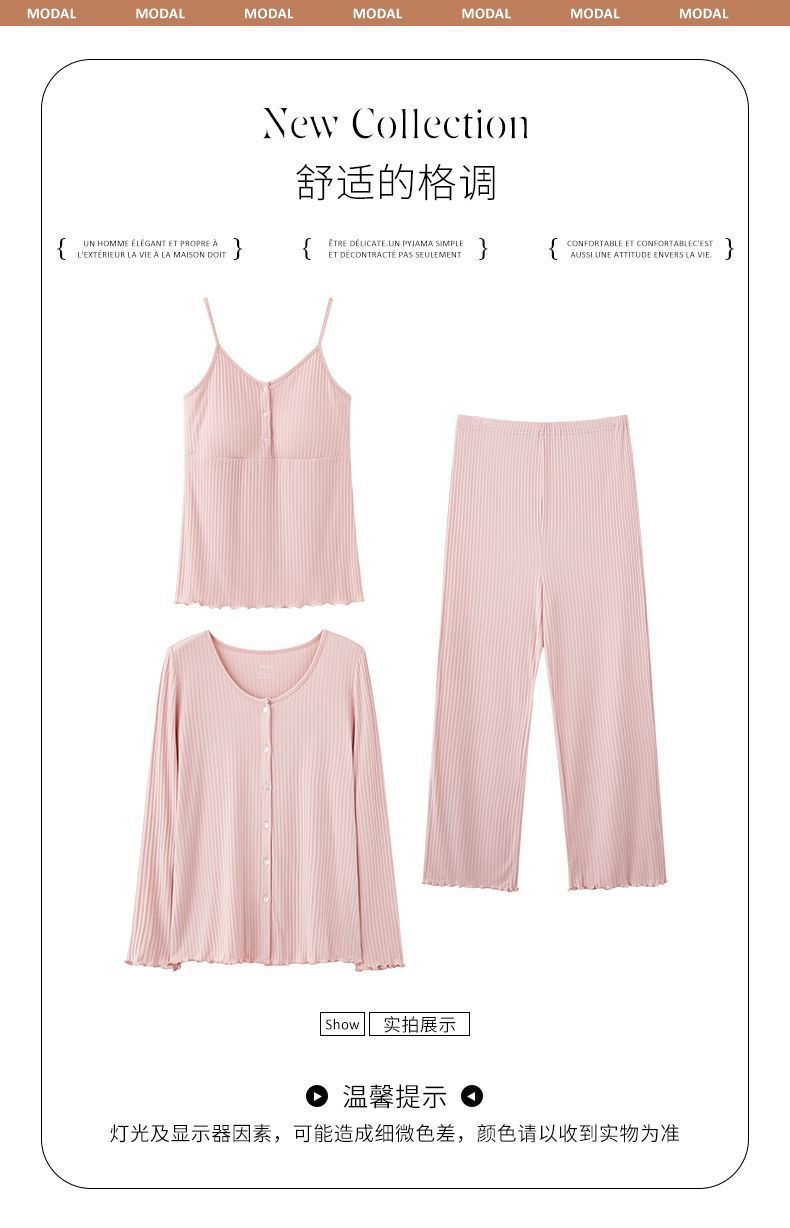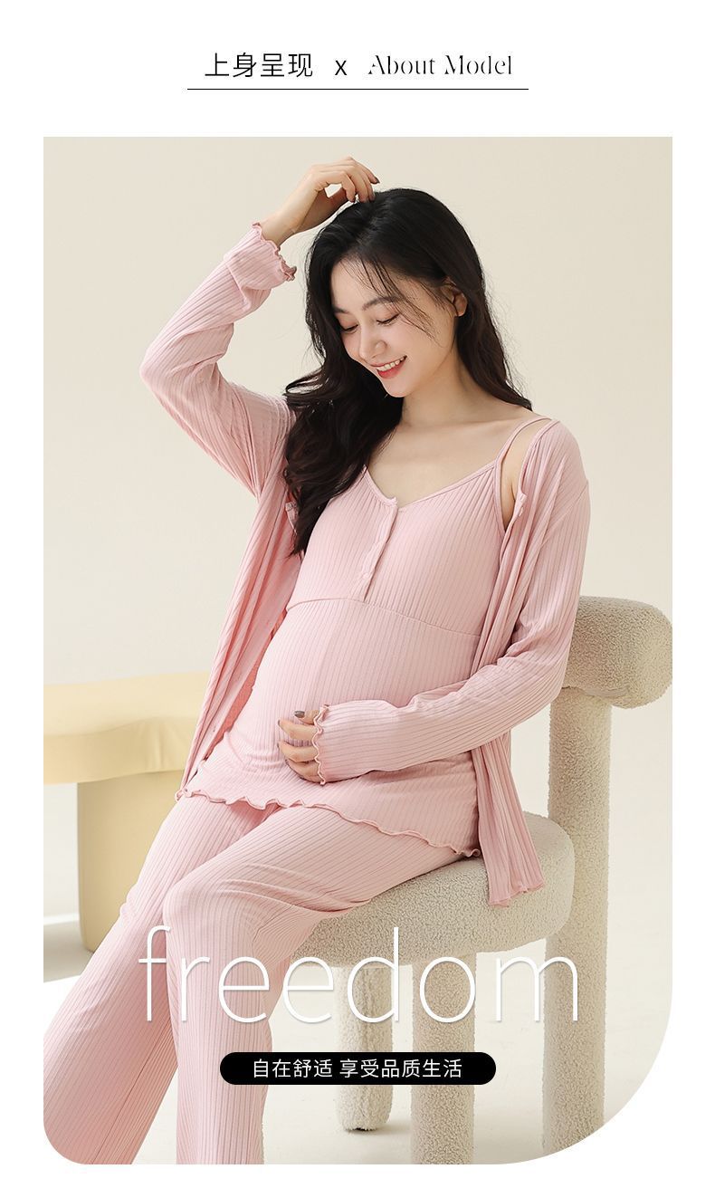 胸パッド付きモーデール月子服春秋長袖ストラップ長ズボン三点セット妊婦授乳可アウターホームウェア