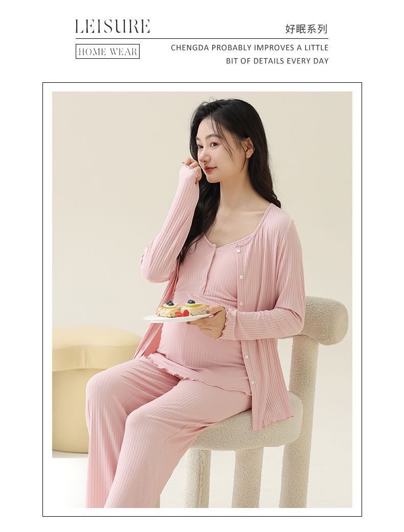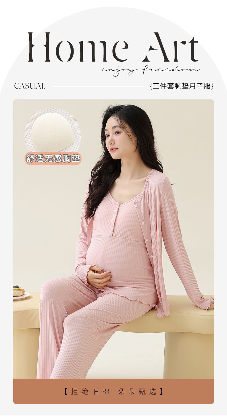 月子服妊婦モーダルパジャマ女性春秋胸パッド付き三点セット吸汗通気性授乳ホームウェア