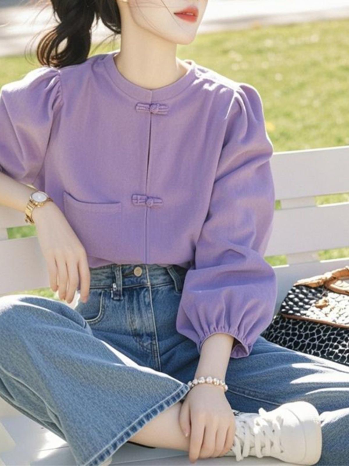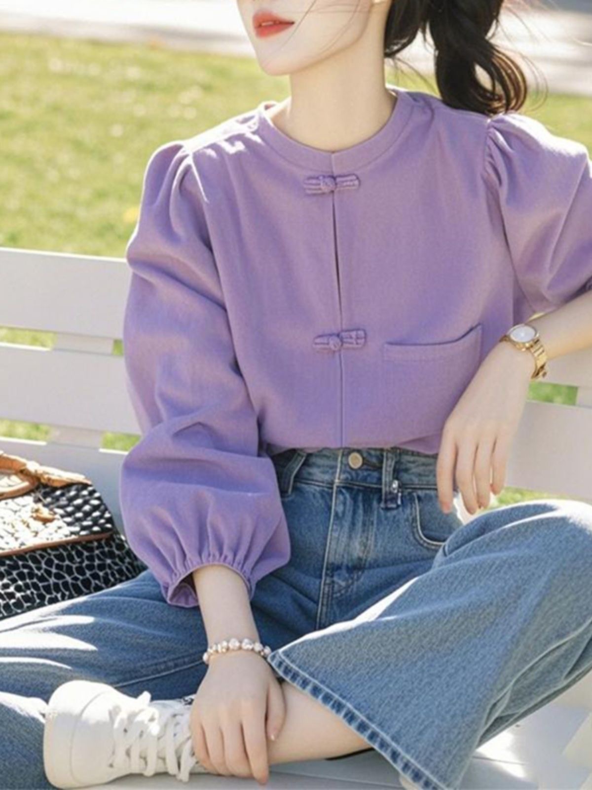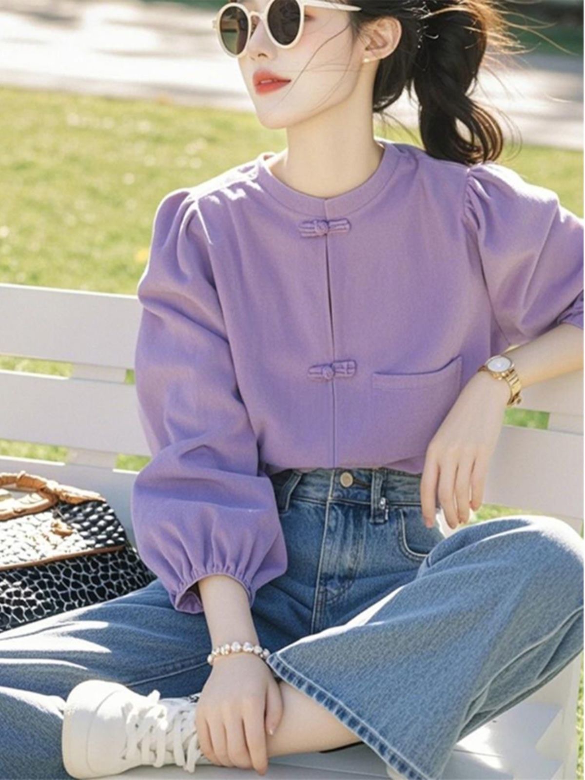 紫のvネックのシャツの女性の春の新型の長袖の気質のハイエンドはやせているシャツの独特なデザイン感の独特な上着を現します。