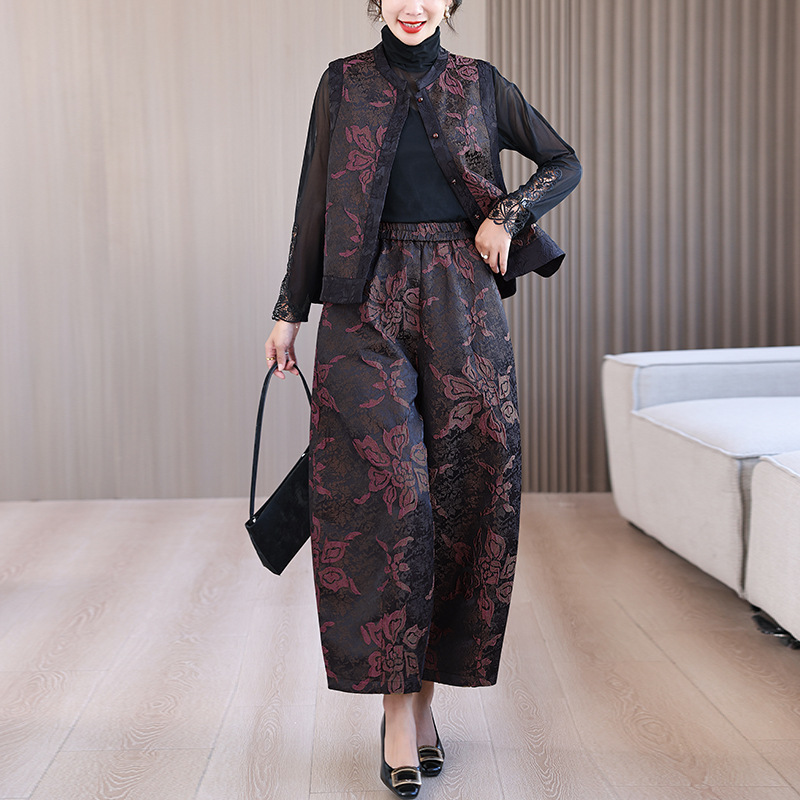 2025秋季新款中年妈妈休闲百搭花苞阔腿裤女时尚洋气马甲两件套