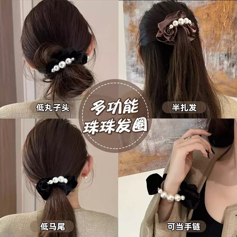 韩系千金公主风丝绒珠珠大肠发圈高级感低丸子头发绳气质头绳发饰