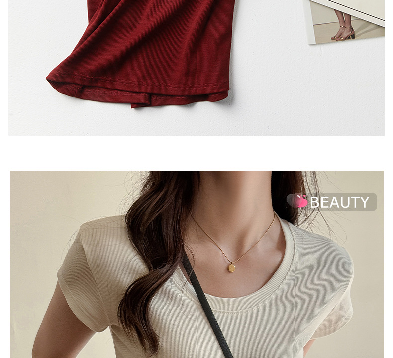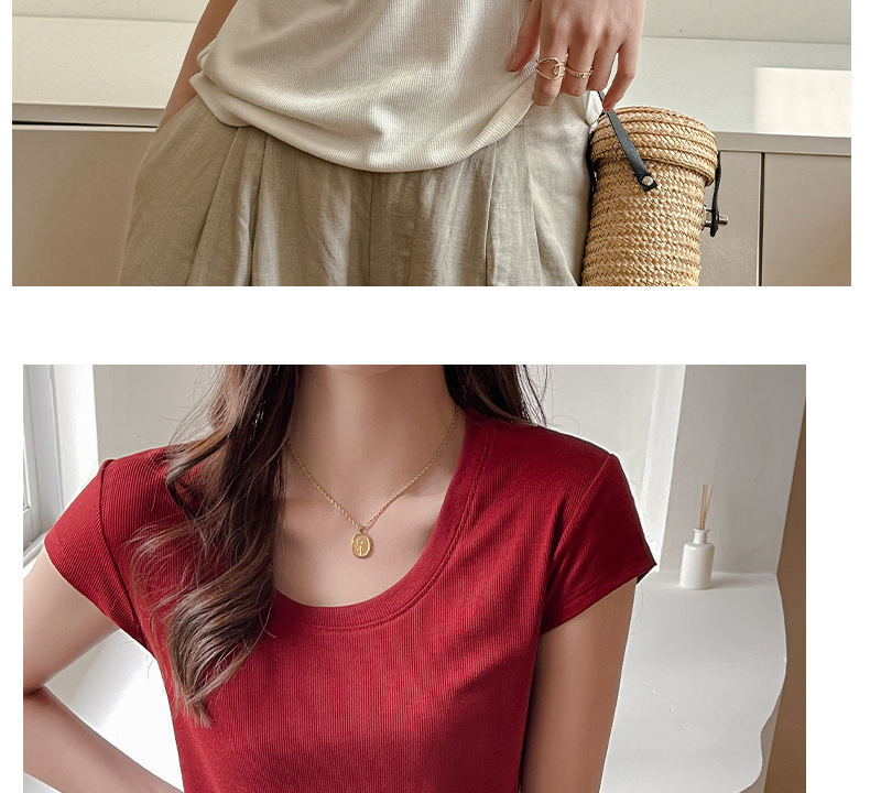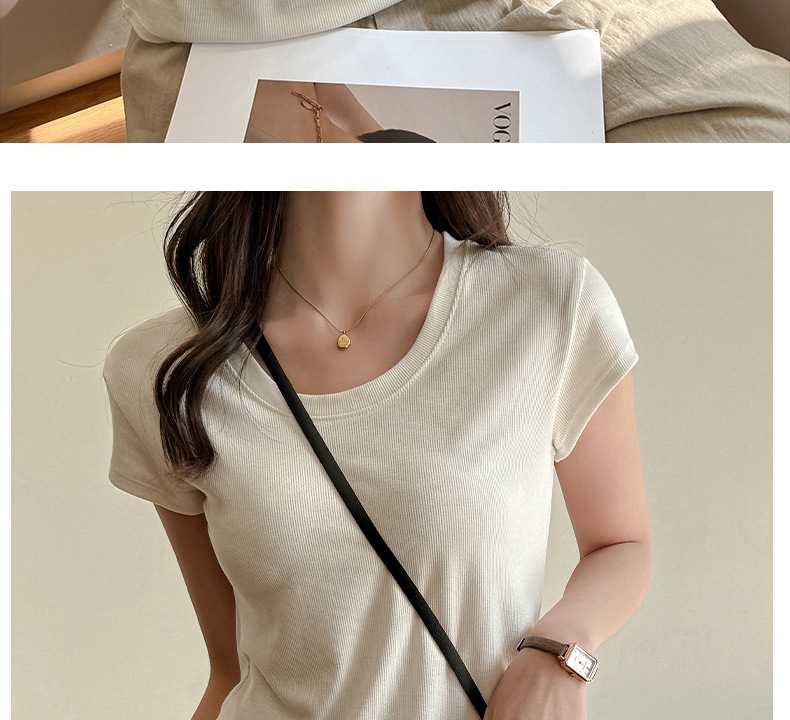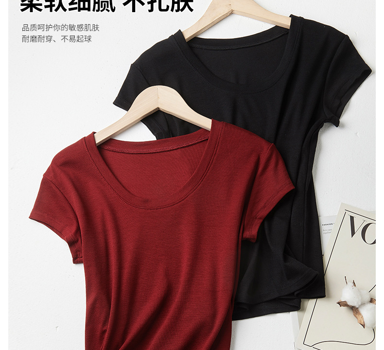純綿のねじの小さい丸首の修身の短いタイプの底のシャツの女性の中で肩の半袖のtシャツを掛けて春夏に上着を着ることができます。