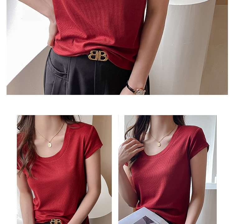 韓国系の小さい丸首の高級なデザイン感の正肩の半袖のtシャツの女性のサイドのしわの修身の底のシャツの夏の上着