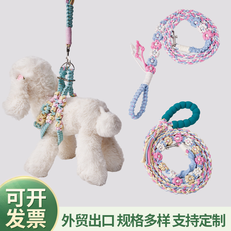 手工编织宠物牵引绳跨境遛狗绳子适用狗狗胸背创意编织花朵牵引绳
