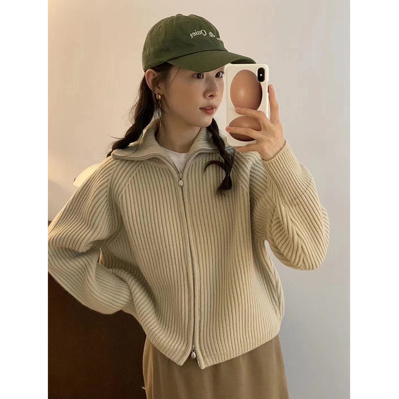 韓国東大門eg*gダブルジッパー縞模様セーター2025春秋ゆったりウールニットカーディガンジャケット