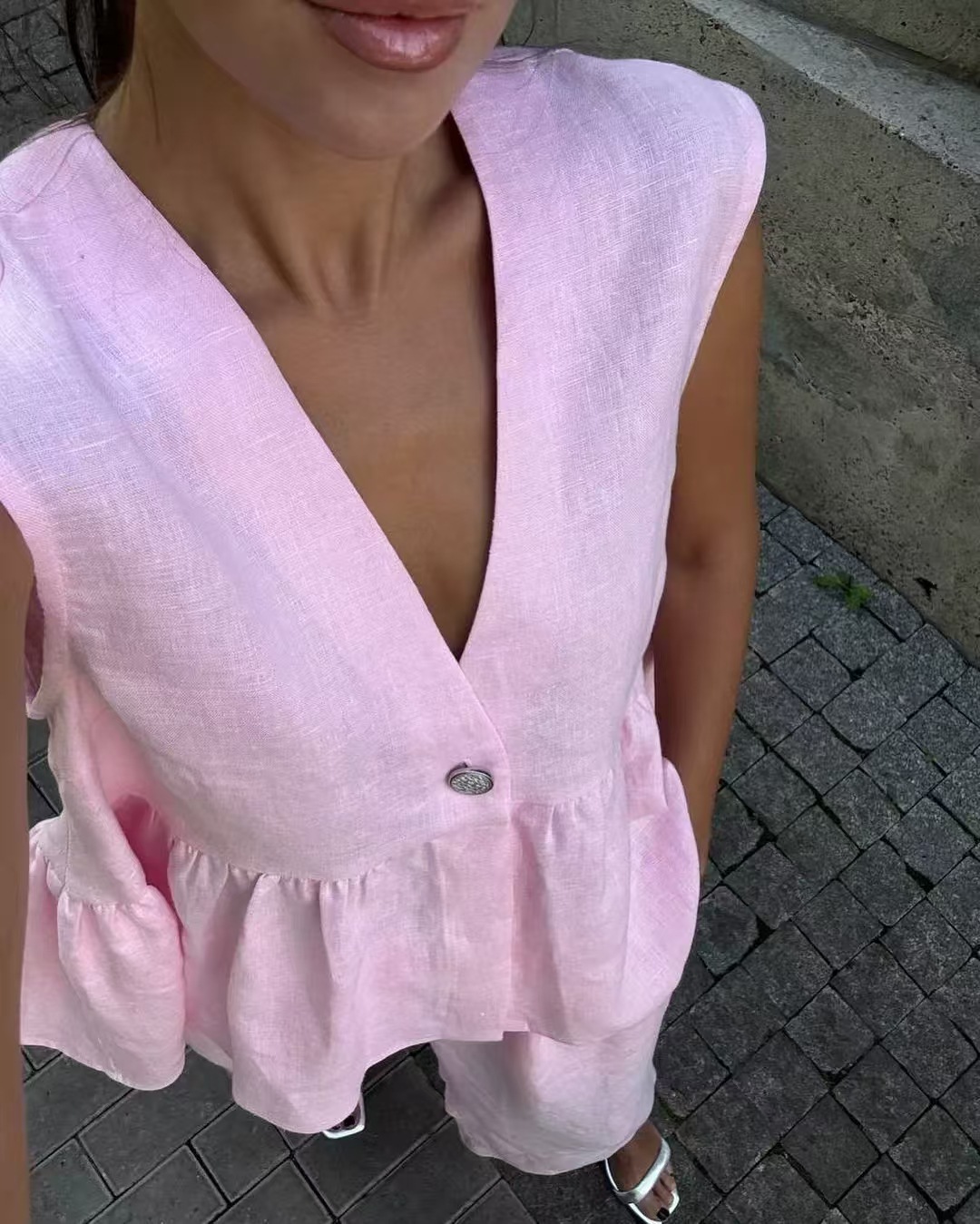 クロスボーダー綿質2025新品vネックボタンノースリーブ上着ベスト長ズボンセット純色気質通勤2枚