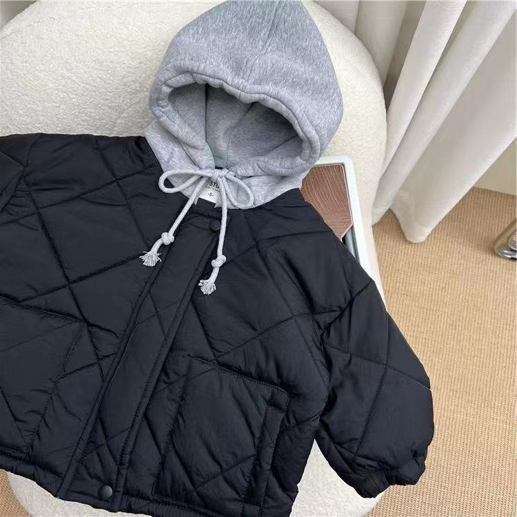 韩版童装秋冬儿童假两件连帽棉衣男女童加厚菱格中长款棉服外套潮
