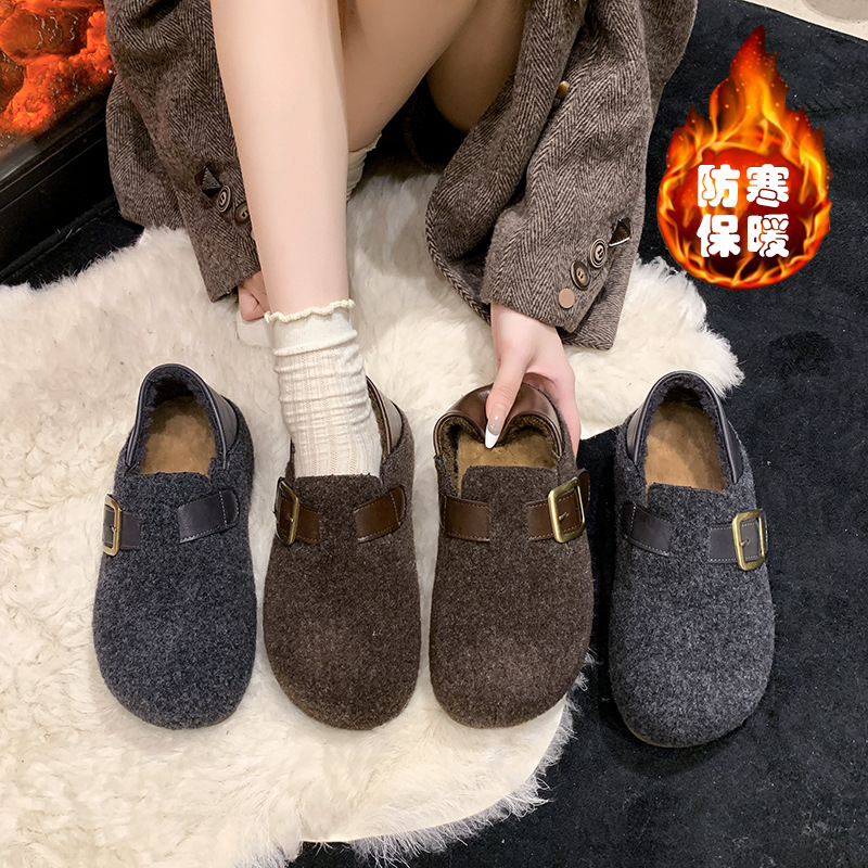 复古内增高两穿勃肯鞋女2025新款秋冬毛呢懒人一脚蹬厚底加绒棉鞋