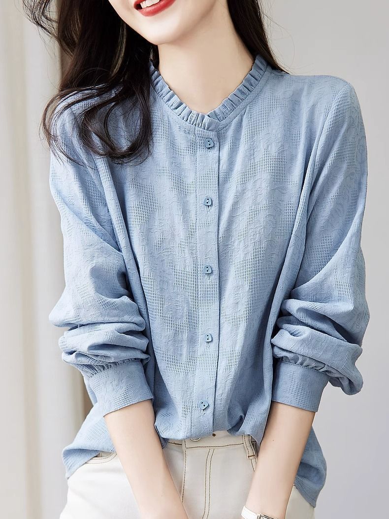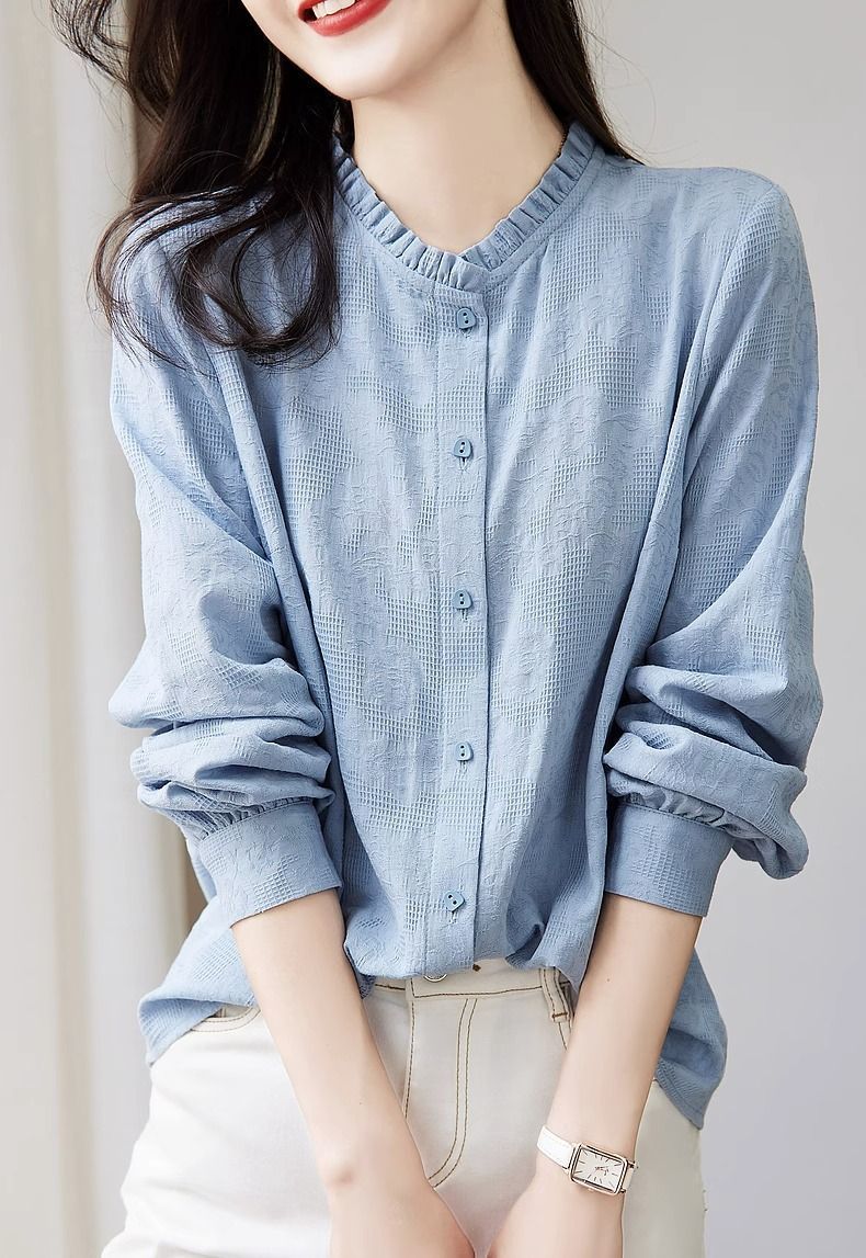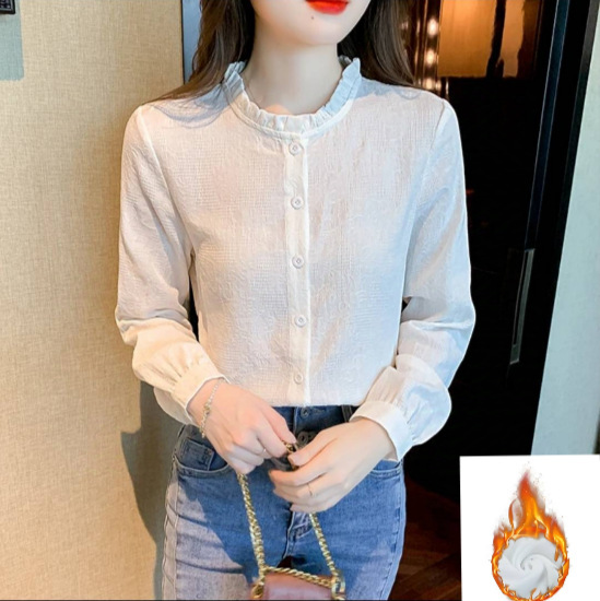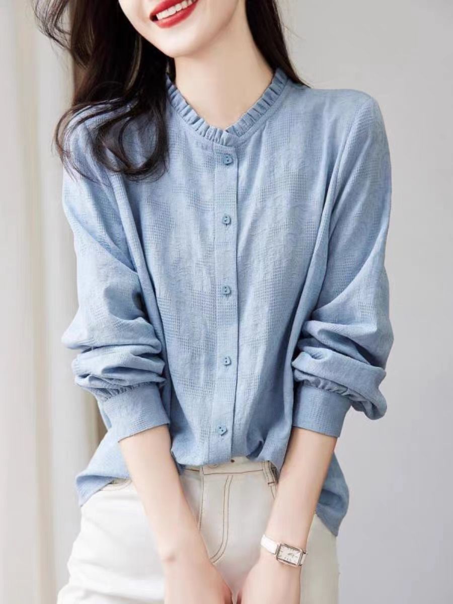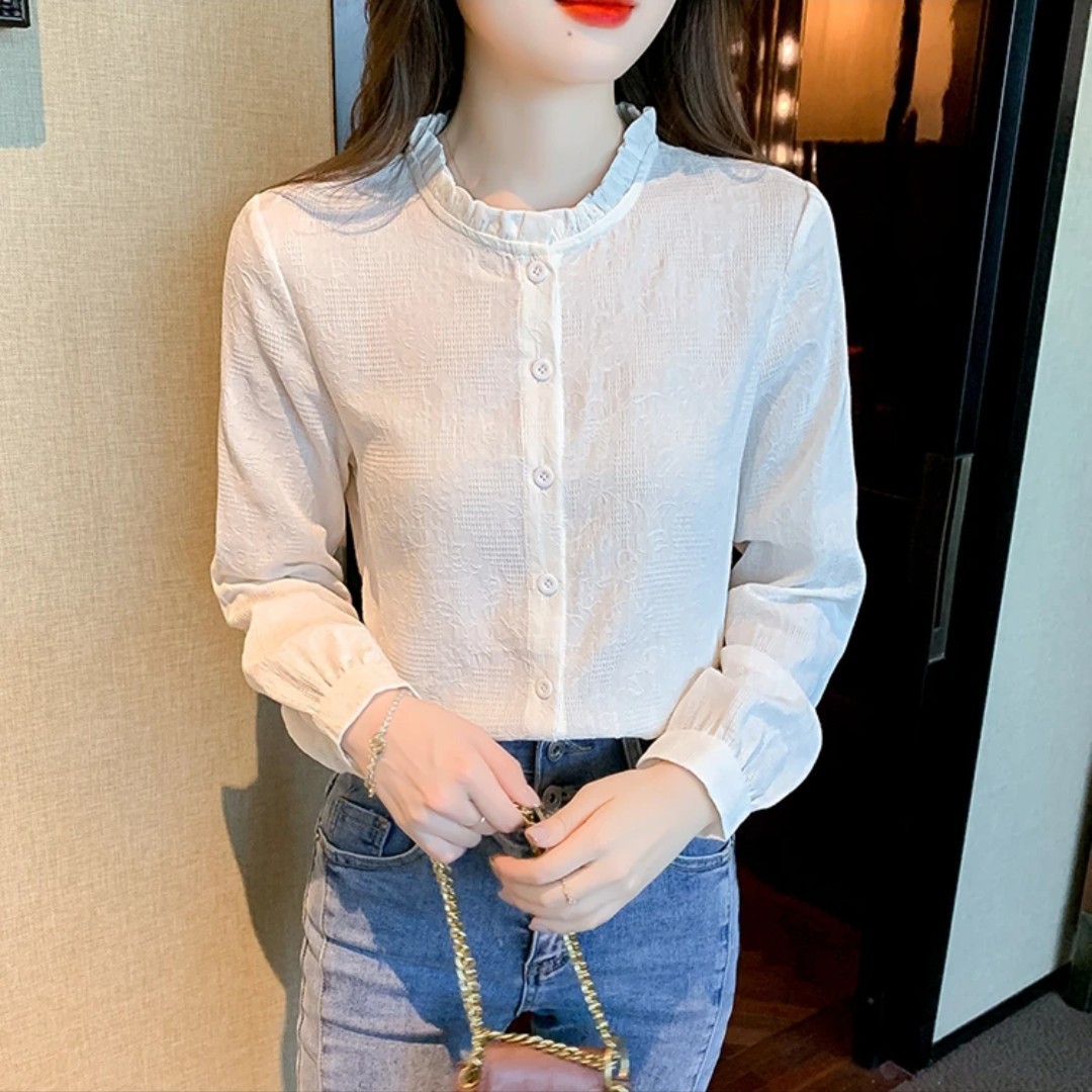 早春2025新型韓国系chi長袖シャツのフリルの縁の襟のシャツの白いその他のシャツの袖のお姉さんの風