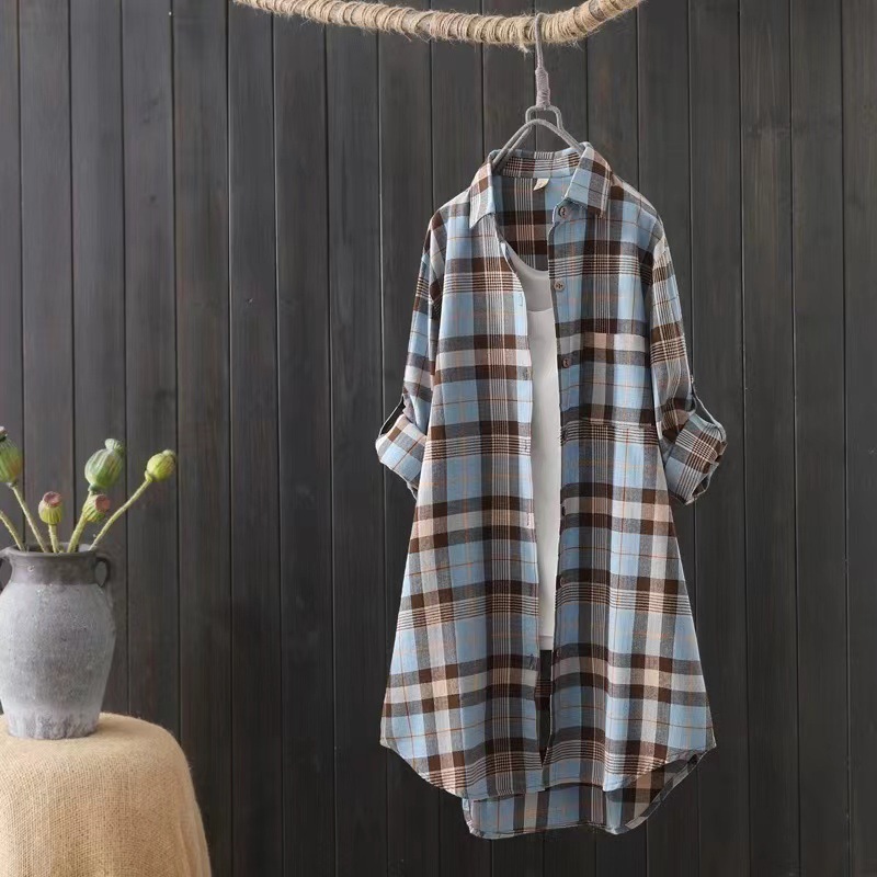 中長の格子のシャツの女性の2023春秋の新型のシャツの韓国版の長袖のゆったりしているコートの上着