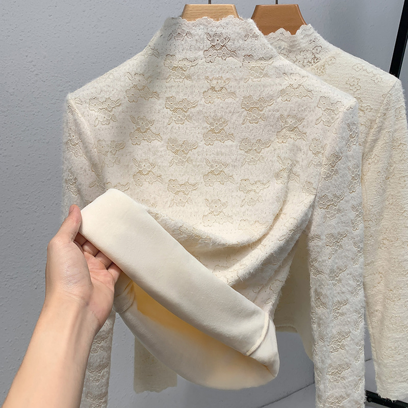 ハイネックインナーウェア レディース 2025年新作 優しいスタイル クロシェ編みレースシャツ 保温性のある裏起毛厚手トップス