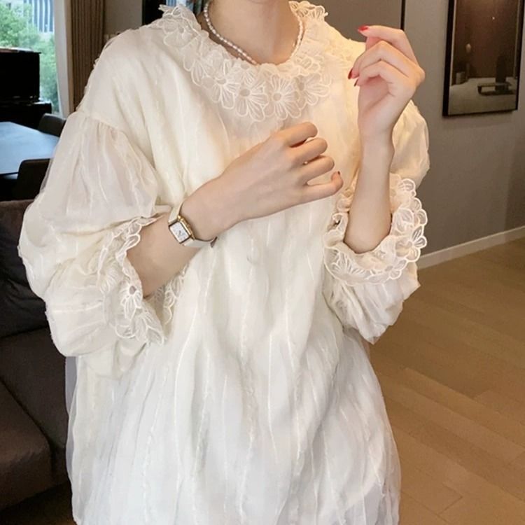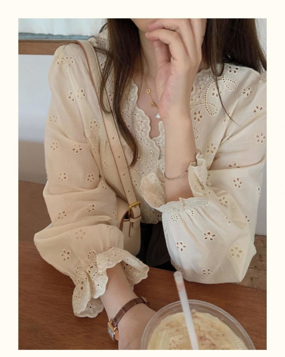 2025早春のシャツの新型韓国の泡袖の透かし彫りの花の縁の襟の子供のシャツのレースの底のシャツの女性の上着