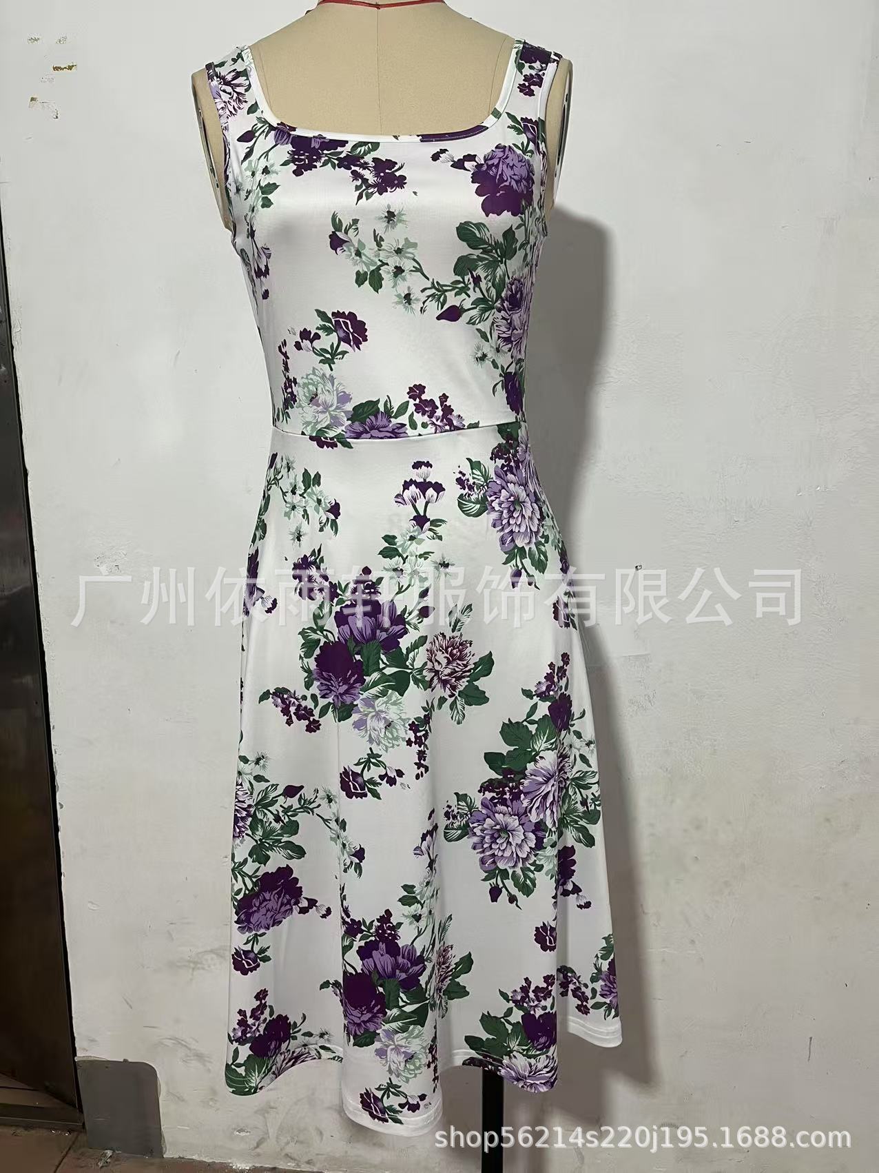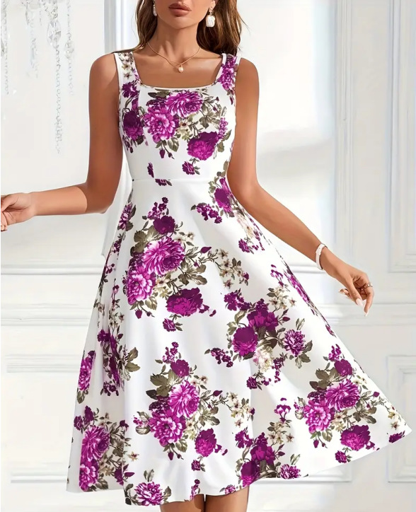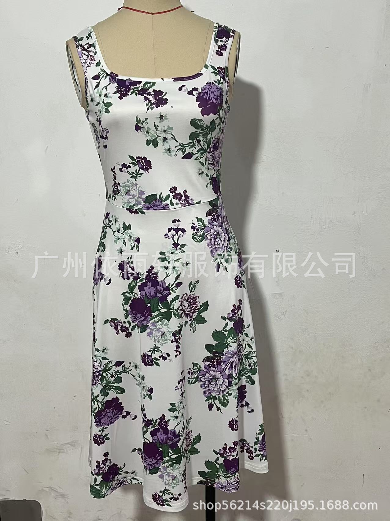 跨境欧美外贸大码优雅合体连衣裙花朵印花休闲无袖法式吊带连衣裙