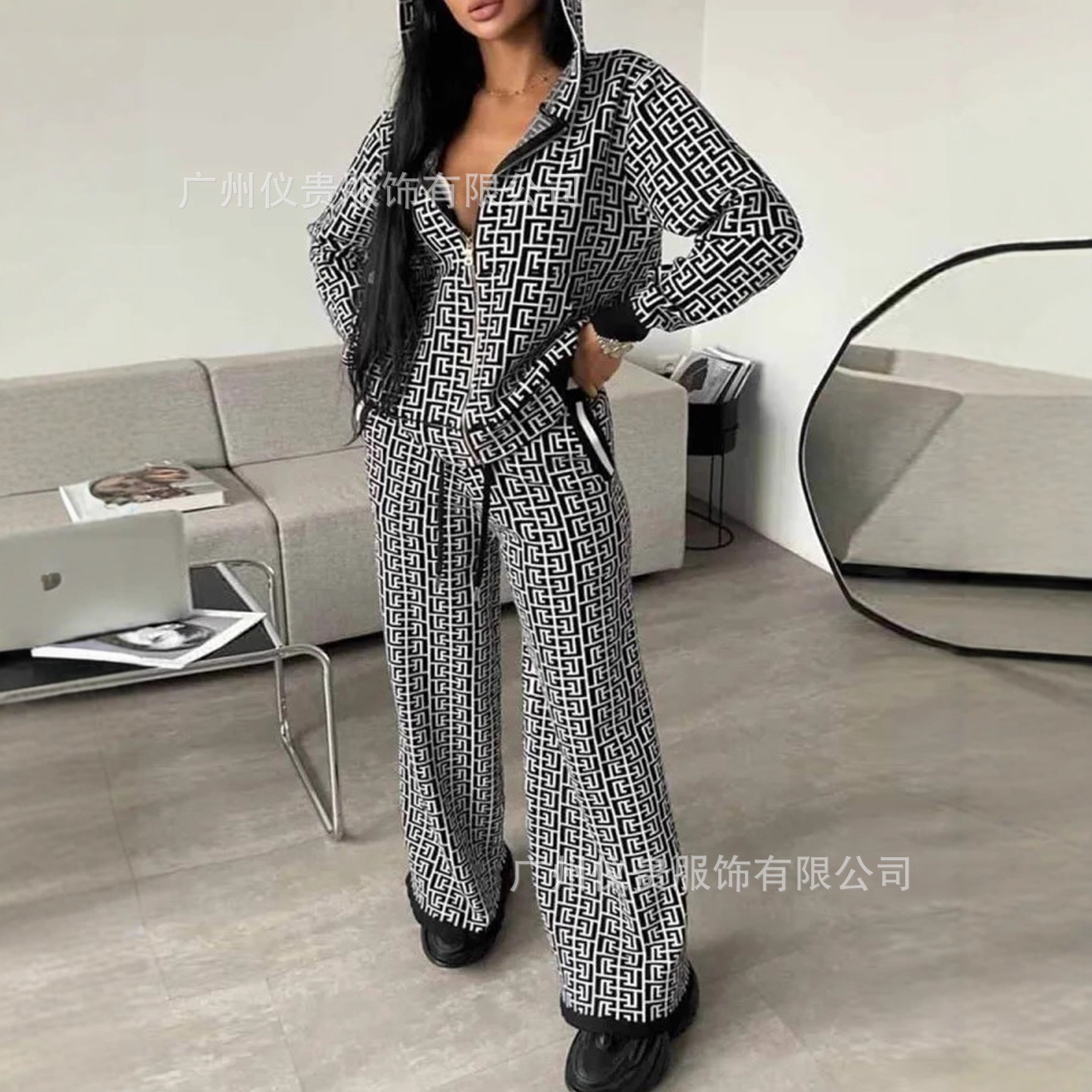 跨境欧美大码时尚套装格子印花针织开衫带帽上衣阔腿长裤两件套