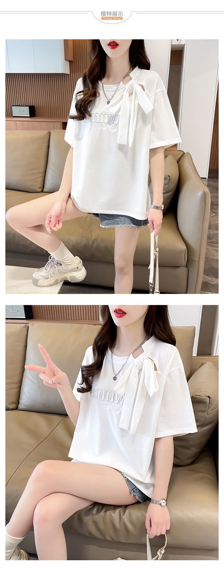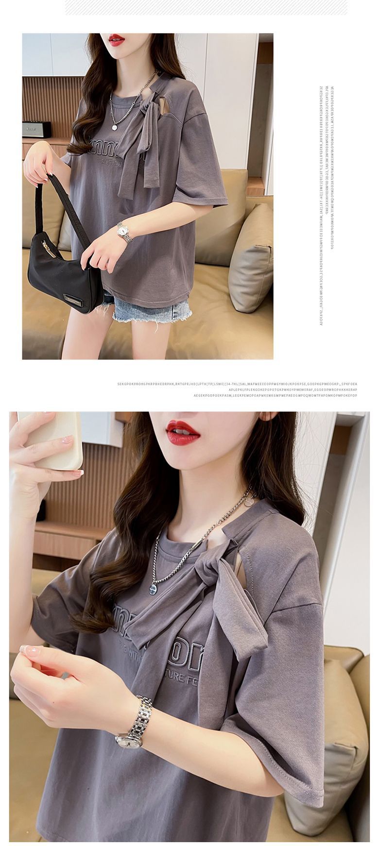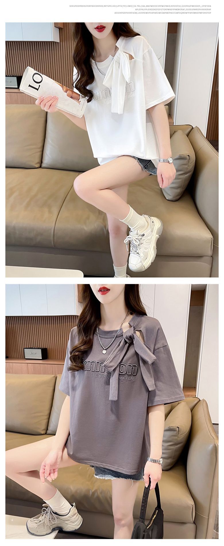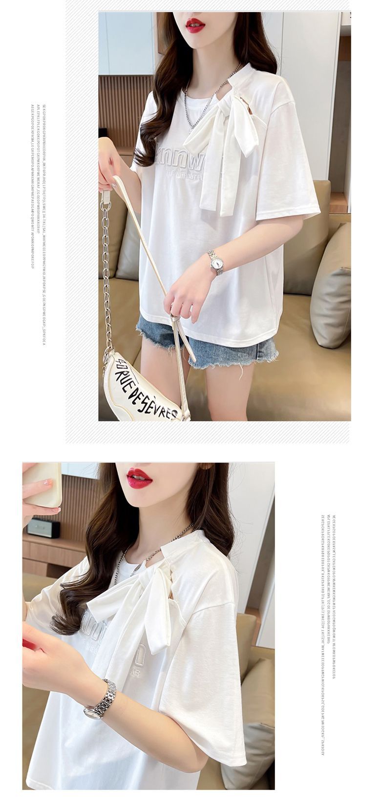 夏のデザイン感蝶結びtシャツ女性2025新刺繍アルファベットゆるい小柄半袖上着女性潮