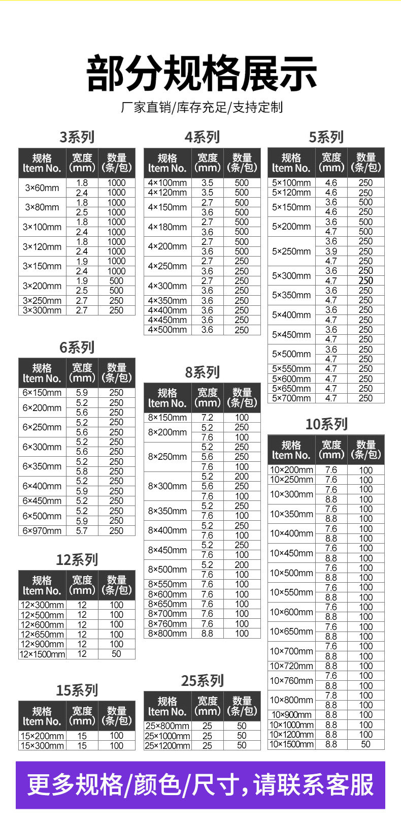 白; 4*150 国家標準 (実際の幅 3.6 mm、50 ストリップ),白; 4*200 国家標準 (実際の幅 3.6 mm、50 ストリップ),白; 4*250 国家標準 (実際の幅 3.6 mm、50 ストリップ),白; 4*300 国家標準 (実際の幅 3.6 mm、50 ストリップ),白; 5*150 国家標準 (実際の幅 4.8 mm、50 ストリップ),白; 5*200 国家標準 (実際の幅 4.8 mm、50 ストリップ),白; 5*250 国家標準 (実際の幅 4.8 mm、50 ストリップ),白; 5*300 国家標準 (実際の幅 4.8 mm、50 ストリップ),白; 5*400 国家標準 (実際の幅 4.8 mm、50 ストリップ),白; 8*150 国家標準 (実際の幅 7.6 mm、50 ストリップ),白; 8*200 国家標準 (実際の幅 7.6 mm、50 ストリップ),白; 8*250 国家標準 (実際の幅 7.6 mm、50 ストリップ),白; 8*300 国家標準 (実際の幅 7.6 mm、50 ストリップ),白; 8*400 国家標準 (実際の幅 7.6 mm、50 ストリップ),白; 8*500 国家標準 (実際の幅 7.6 mm、50 ストリップ),黒; 4*150 国家標準 (実際の幅 3.6 mm、50 ストリップ),黒; 4*200 国家標準 (実際の幅 3.6 mm、50 ストリップ),黒; 4*250 国家標準 (実際の幅 3.6 mm、50 ストリップ),黒; 4*300 国家標準 (実際の幅 3.6 mm、50 ストリップ),黒; 5*150 国家標準 (実際の幅 4.8 mm、50 ストリップ),黒; 5*200 国家標準 (実際の幅 4.8 mm、50 ストリップ),黒; 5*250 国家標準 (実際の幅 4.8 mm、50 ストリップ),黒; 5*300 国家標準 (実際の幅 4.8 mm、50 ストリップ),黒; 5*400 国家標準 (実際の幅 4.8 mm、50 ストリップ),黒; 8*150 国家標準 (実際の幅 7.6 mm、50 ストリップ),黒; 8*200 国家標準 (実際の幅 7.6 mm、50 ストリップ),黒; 8*250 国家標準 (実際の幅 7.6 mm、50 ストリップ),黒; 8*300 国家標準 (実際の幅 7.6 mm、50 ストリップ),黒; 8*400 国家標準 (実際の幅 7.6 mm、50 ストリップ),黒; 8*500 国家標準 (実際の幅 7.6 mm、50 ストリップ)