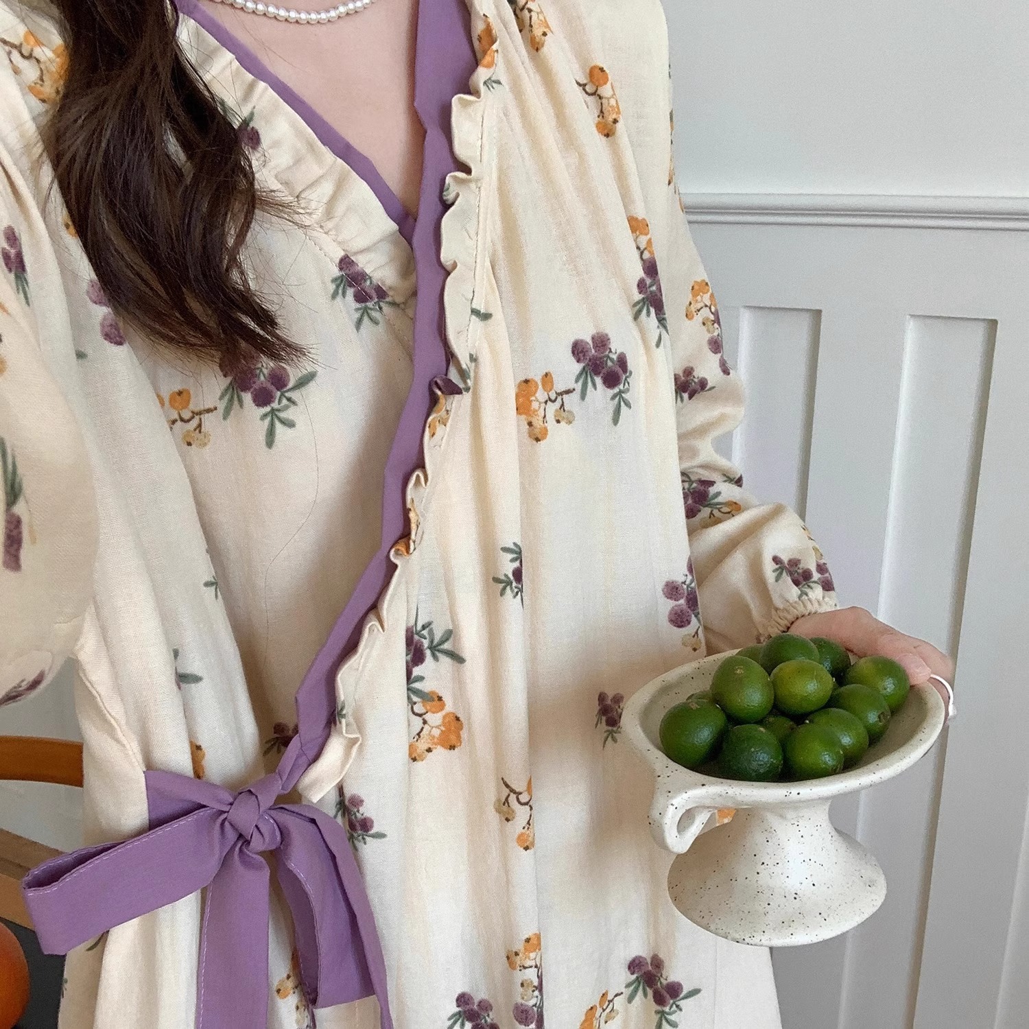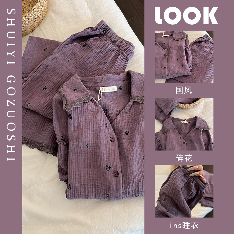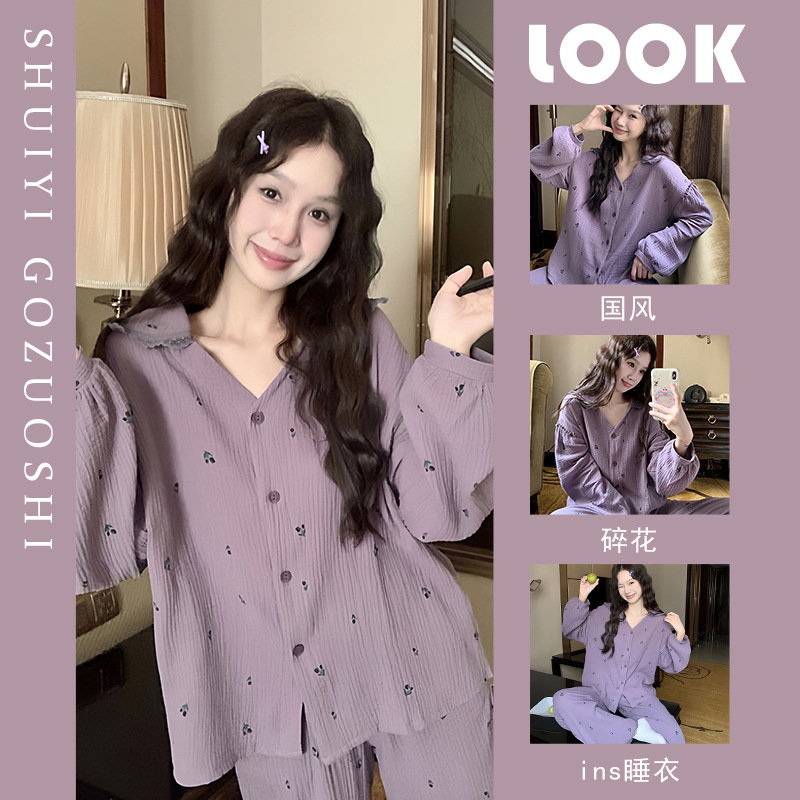 韩系甜美复古紫色碎花睡衣女春秋新款开衫翻领长袖长裤家居服套装