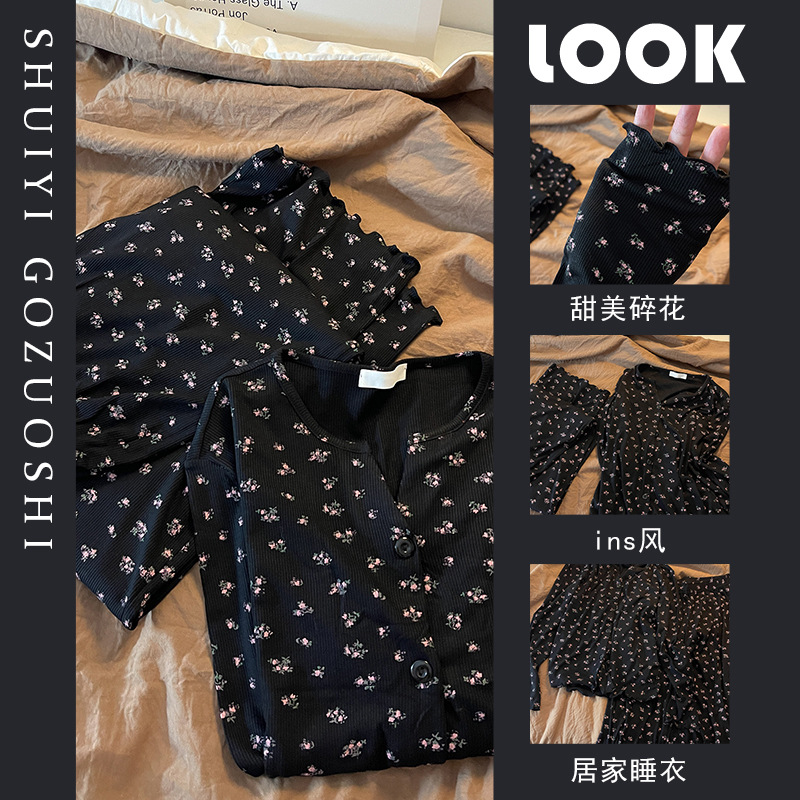 甜美韩系碎花设计印花亲肤睡衣女春秋款开衫长裤家居服套装可外出