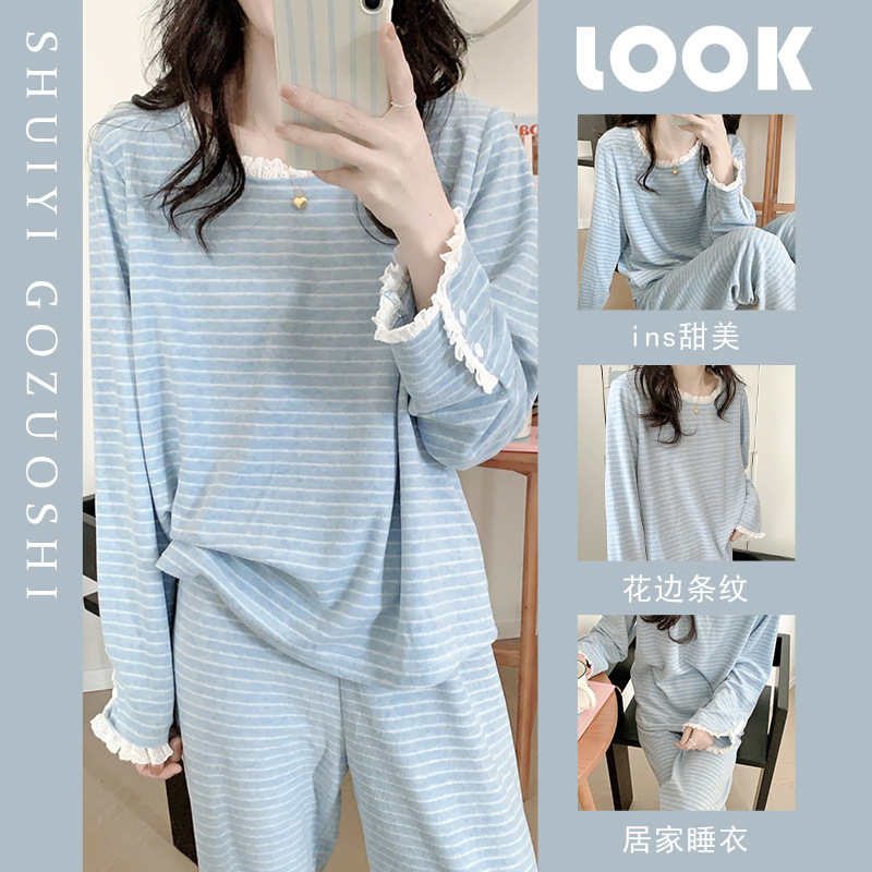 条纹睡衣女新款2025秋冬季高级感加厚保暖薄绒长袖蕾丝家居服套装