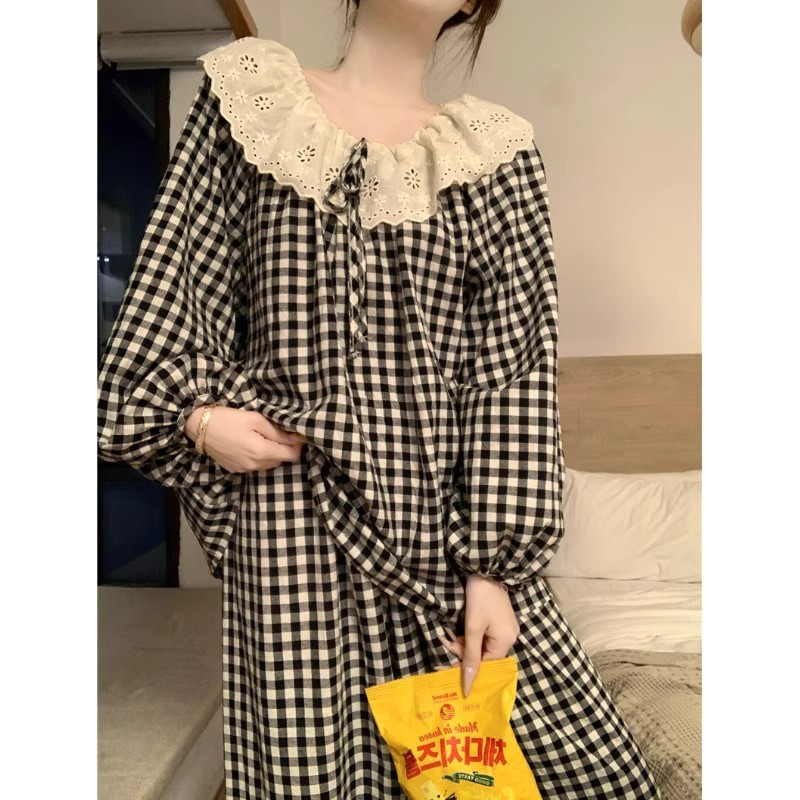 小さな新鮮なチェック柄チェリーチェック柄ナイトガウンナイトガウンパジャマ女性の春と夏の新しい長袖バスローブホーム服夏