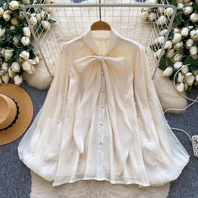 温柔通勤风白色珍珠甜美减龄衬衫女春季长袖蝴蝶结系带法式上衣
