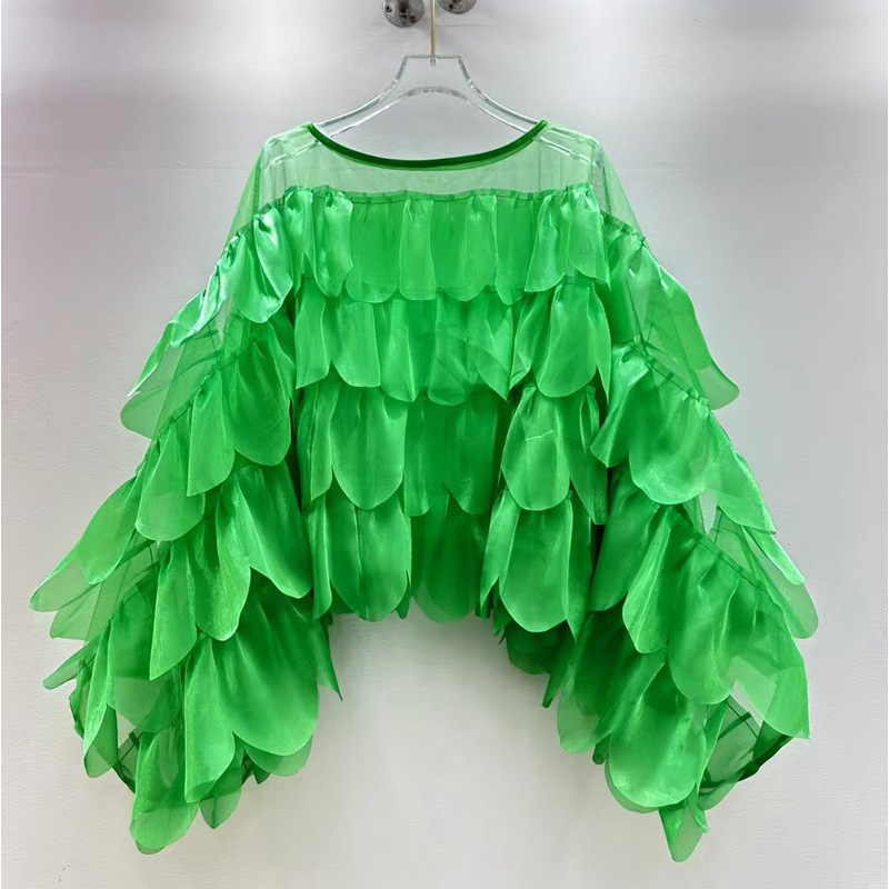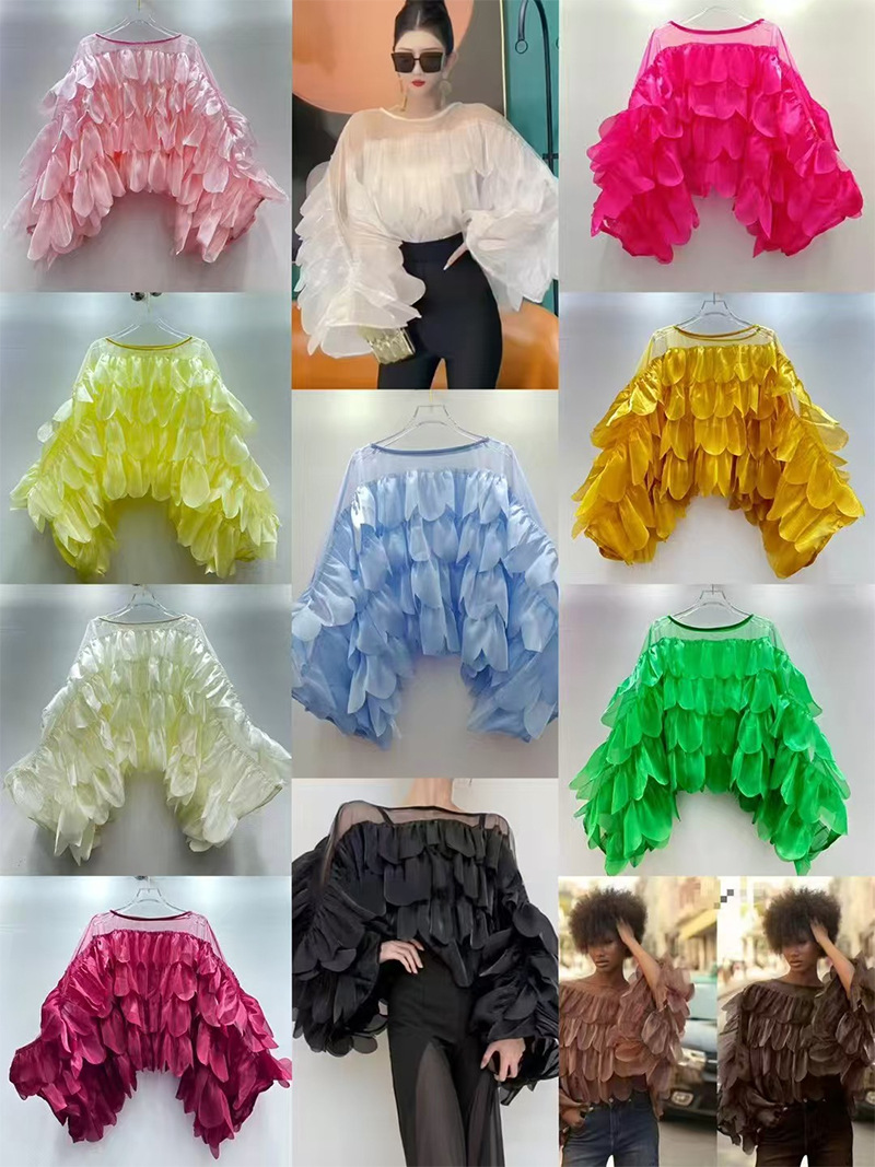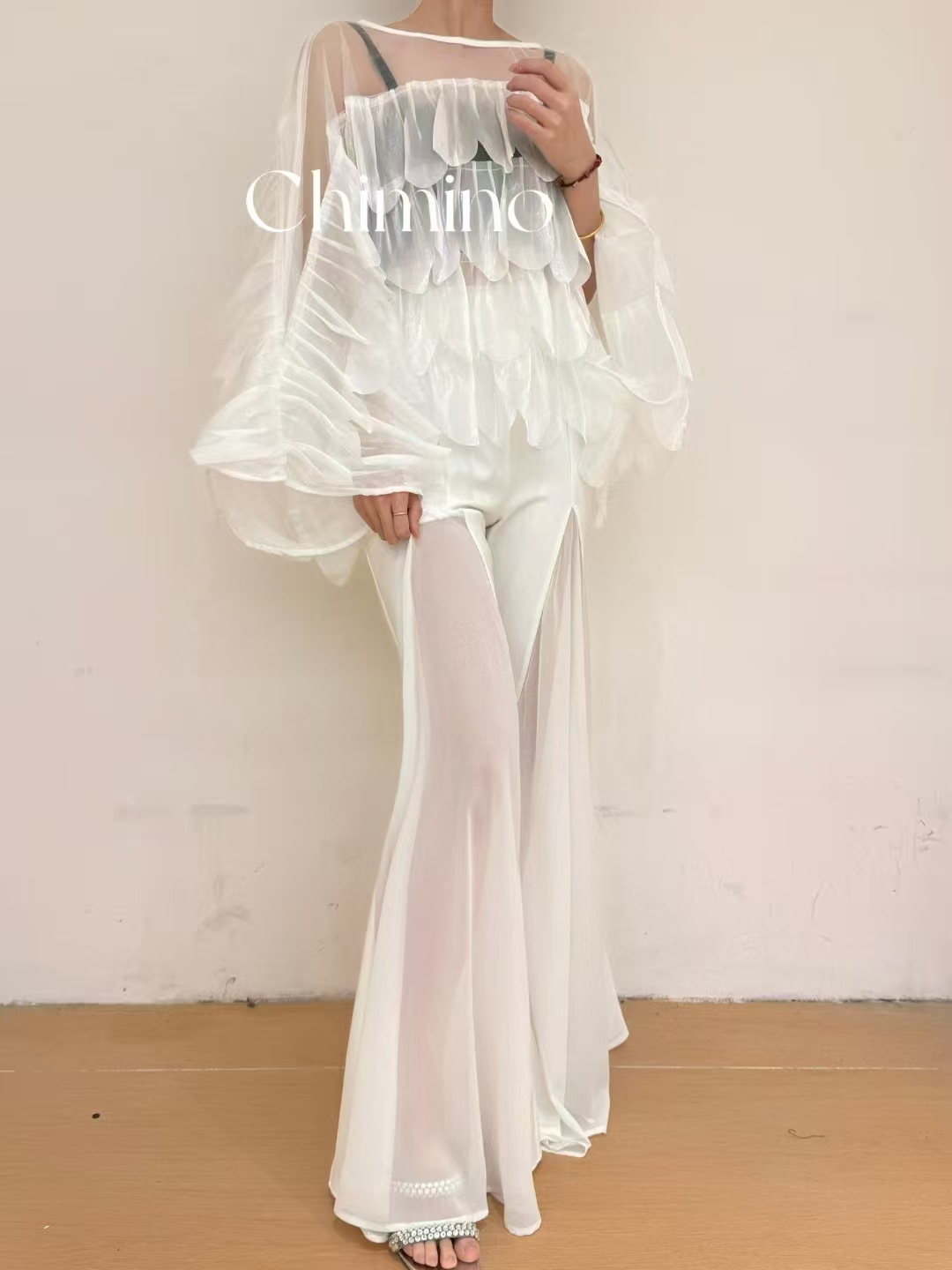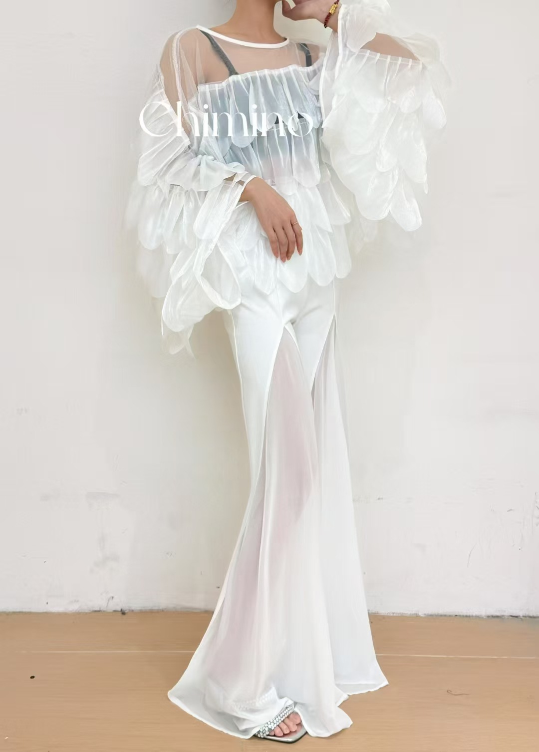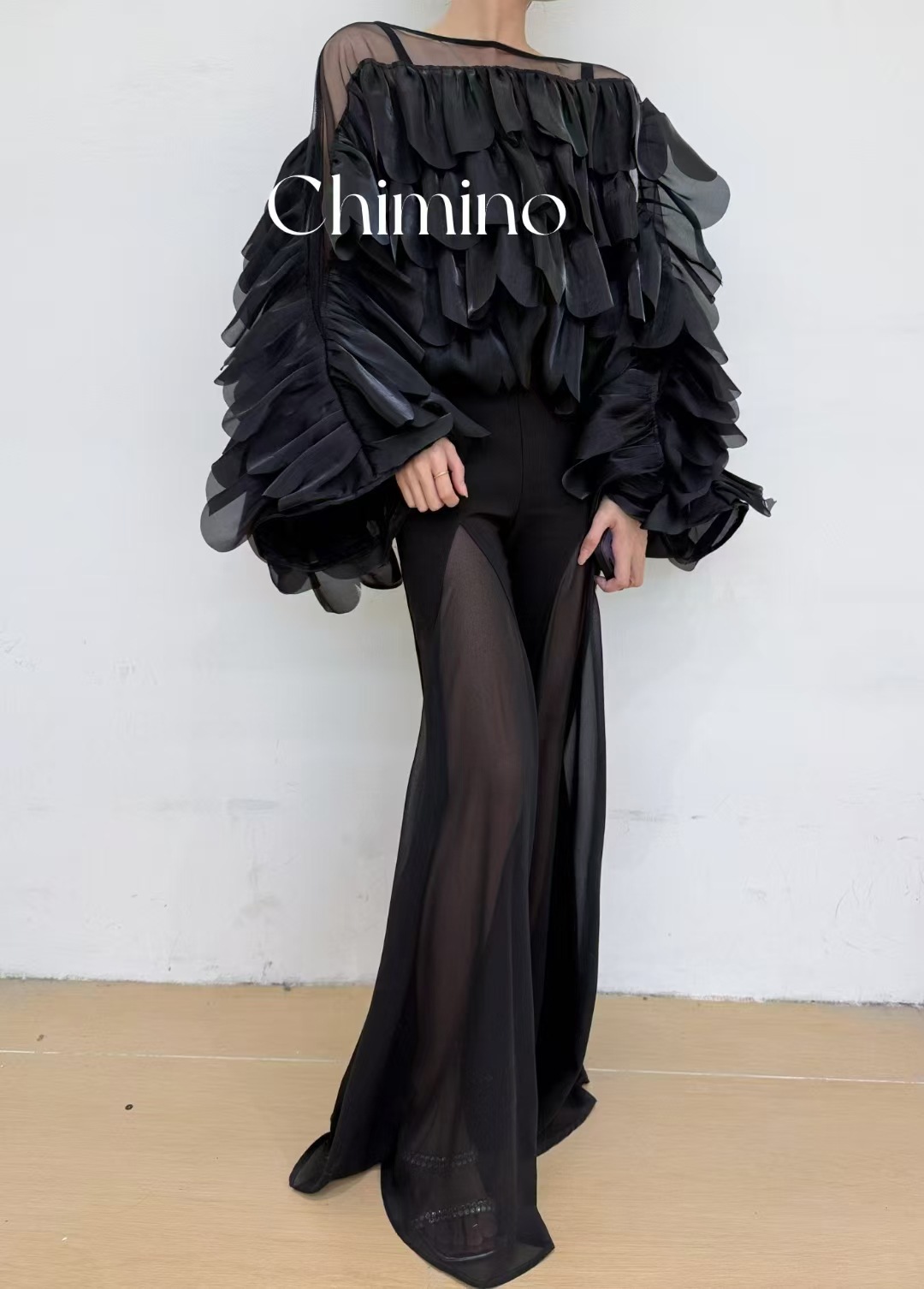 フェアリートップ 2025 夏レイジースタイルセレブフリルスプライシングベルスリーブシフォンシャツルーズシャツ
