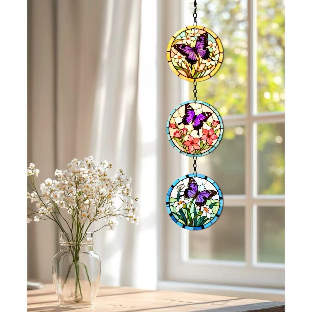 跨境新品玻璃挂件蝴蝶阳光捕捉器彩色玻璃悬挂圆形挂件窗户装饰