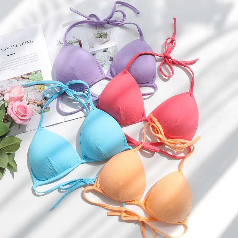 三角カップは首を掛けてストラップを結びます。外は下着を着ます。