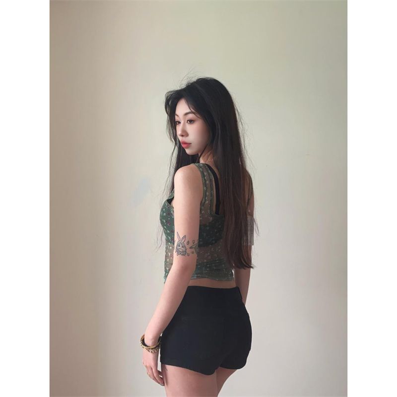 フレンチスタイルの花柄メッシュレイヤードキャミソールレディース夏ピュアセクシースリムフィット万能ショートトップ