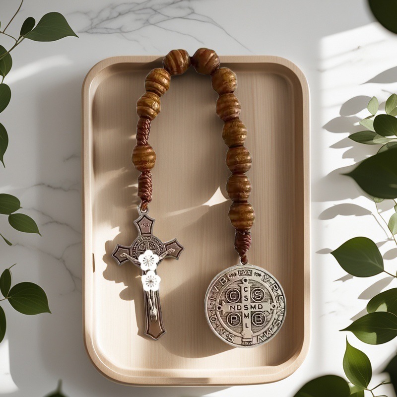 クロスボーダー temu 合金クロス聖ベネディクトメダル祈りポケットロザリオカトリックブラウンウッドビーズ