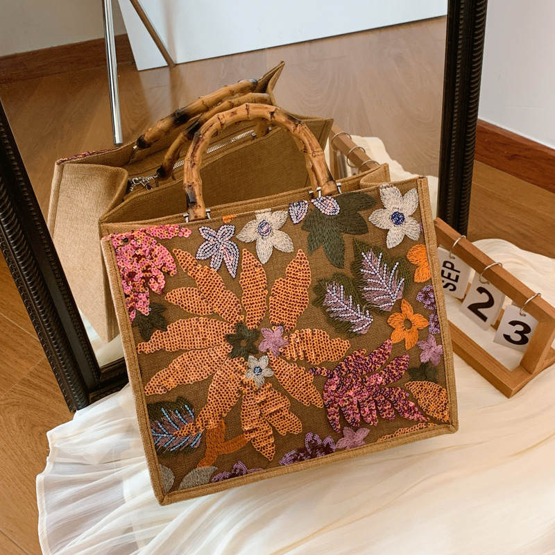 クロスボーダースパンコールストローバッグ、ハイエンドニッチ刺繍バッグ、気質レディーステクスチャードリネン竹ハンドバッグ