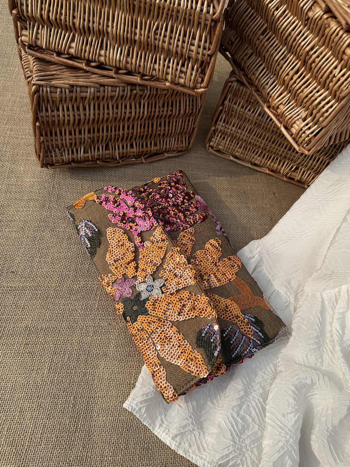 国境を越えた新しい亜麻竹節ハンドバッグ2024の新しい女性バッグ刺繍スパンコール欧米の女性が手に持って夕食バッグを持っている