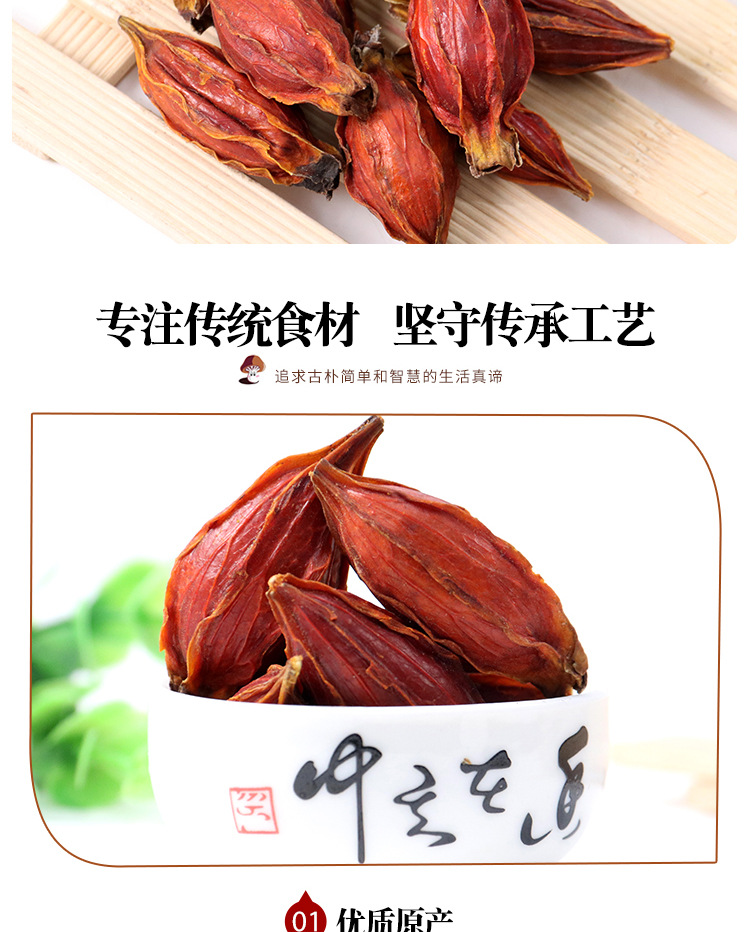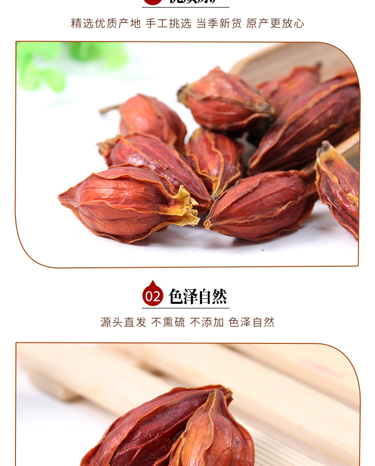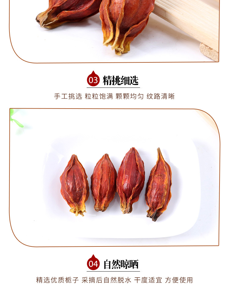 本物の黄色のクチナシの実、山クチナシ、野生の赤いクチナシのドライフルーツは、粉末に挽いてお茶や水に浸して茹でた肉の色付けに使用できます。