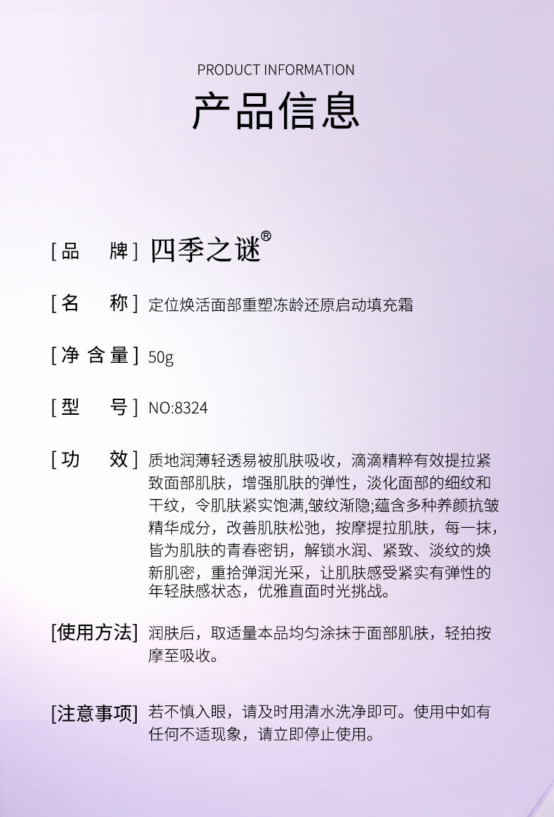 製品名 四季の謎 ポジショニング リバイタライジング フェイシャル リシェイプ フリージング エイジ リストアメント スタート フィリング クリーム