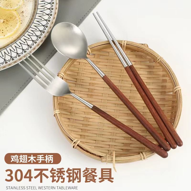 創意的な鶏の羽の木の304ステンレスのスプーンのフォークの箸の実木の柄の復古風の学生は3セットの食器を携帯します。