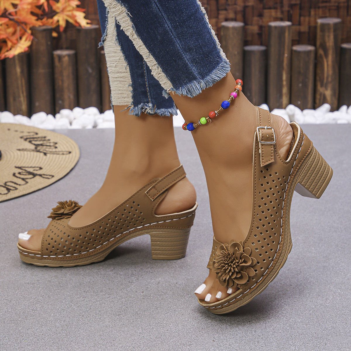 跨境外贸大码花朵粗跟罗马凉鞋2026春夏新款欧美时尚休闲沙滩凉鞋
