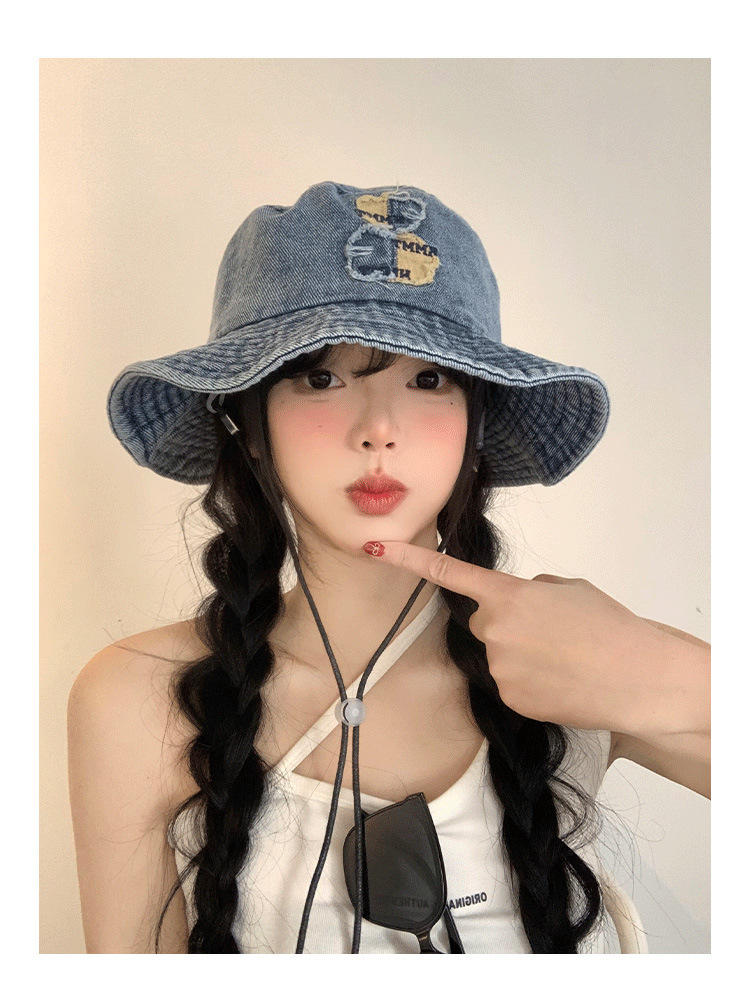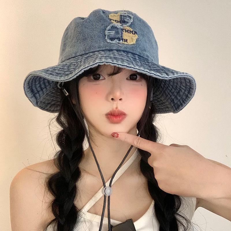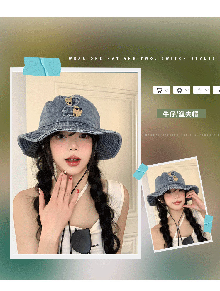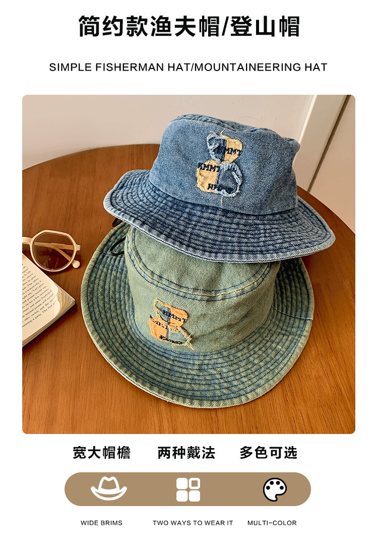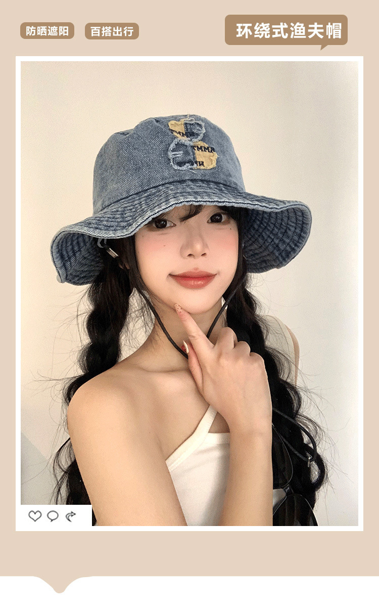 ベアーの水洗いデニムの漁師の帽子の女性の春の夏のモデルの大きいつばの日よけの日焼け止めの盆の帽子の大きい頭は顔の小さい帽子を囲んで現れます。