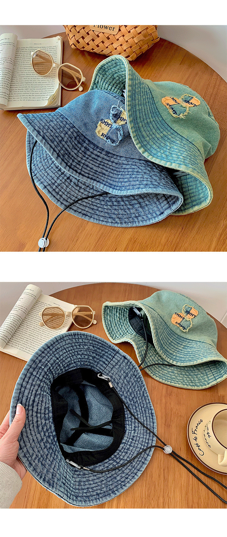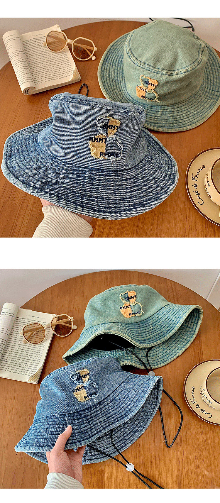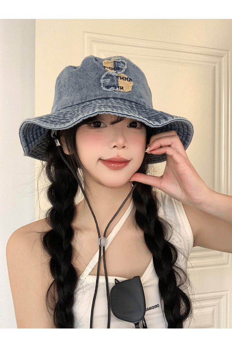 ベアーの水洗いデニムの漁師の帽子の女性の春の夏のモデルの大きいつばの日よけの日焼け止めの盆の帽子の大きい頭は顔の小さい帽子を囲んで現れます。
