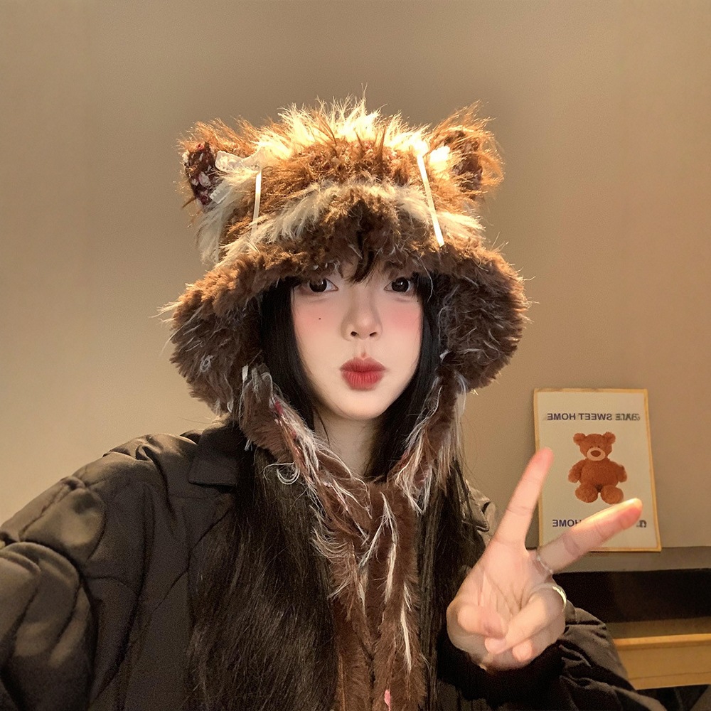 蝴蝶结可爱猫耳朵毛绒帽女秋冬季防寒保暖针织护耳帽流苏针织帽子