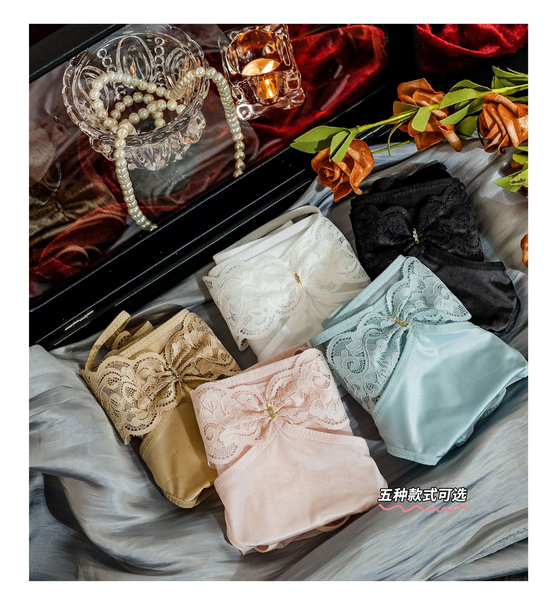 闪钻女人~植绒甜美纯欲女内裤 网纱蝴蝶结丝绒中腰三角女士内裤