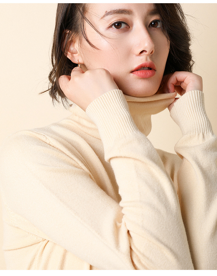 高襟のセーターを引く女性は冬に高襟のシャツを厚くします。