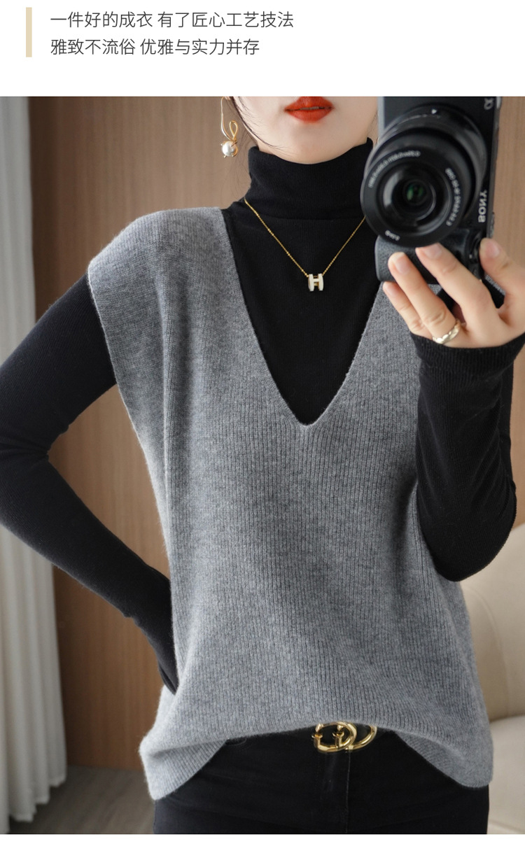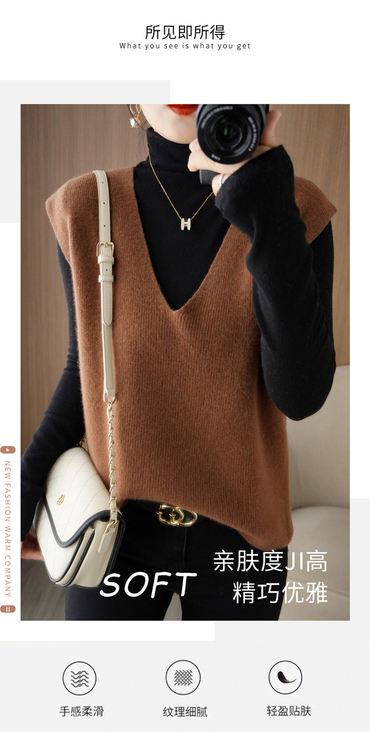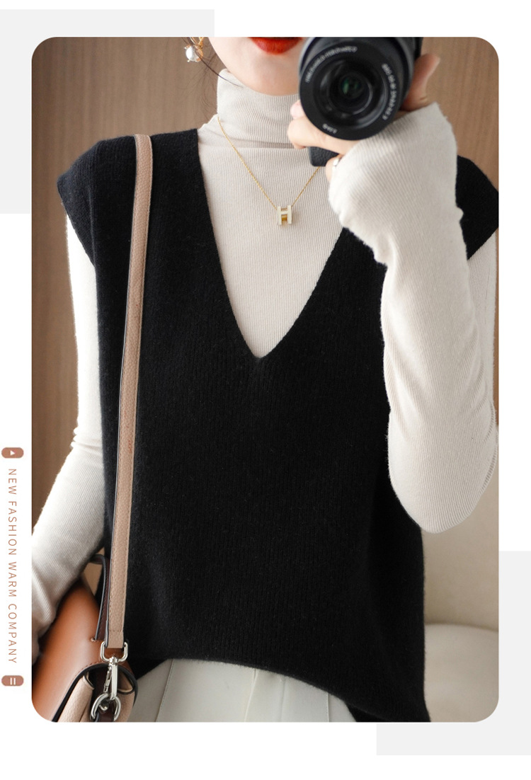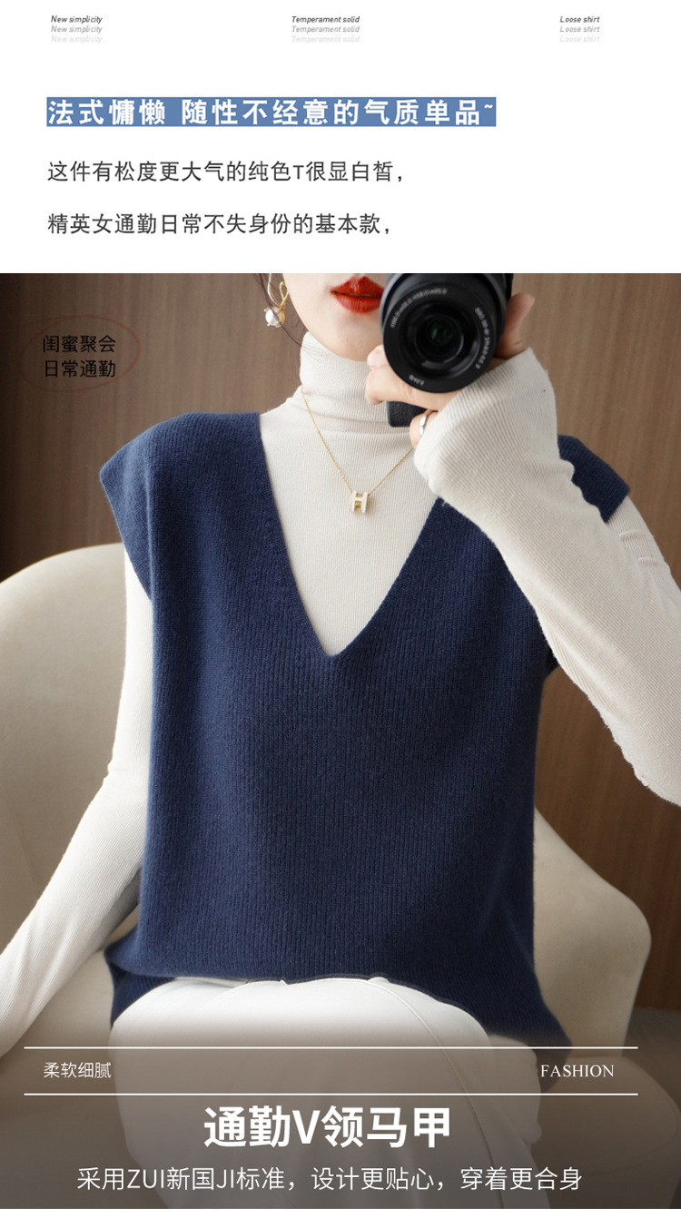 ウール混紡2025秋冬新作レディースゆったりVネックショート丈無地プルオーバーニットベスト